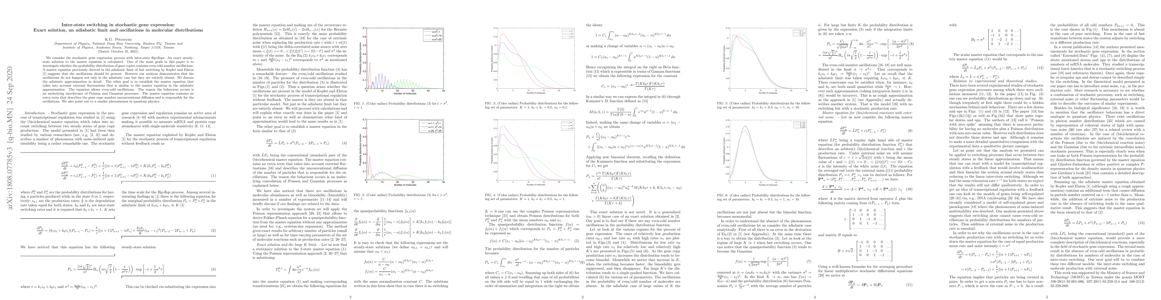 We consider the stochastic gene expression process with inter-state flip-flops. An exact steady-state solution to the master equation is calculated. One of the main goals in this paper is to investigate whether the probability distribution of gene copies contains even-odd number oscillations. A master equation previously derived in the adiabatic limit of fast switching by Kepler and Elston \cite{kepler} suggests that the oscillations should be present. However our analysis demonstrates that the oscillations do not happen not only in the adiabatic case but they are entirely absent. We discuss the adiabatic approximation in detail. The other goal is to establish the master equation that takes into account external fluctuations that is similar to the master equation in the adiabatic approximation. The equation allows even-odd oscillations. The reason the behaviour occurs is an underlying interference of Poisson and Gaussian processes. The master equation contains an extra term that describes the gene copy number unconventional diffusion and is responsible for the oscillations. We also point out to a similar phenomenon in quantum physics.