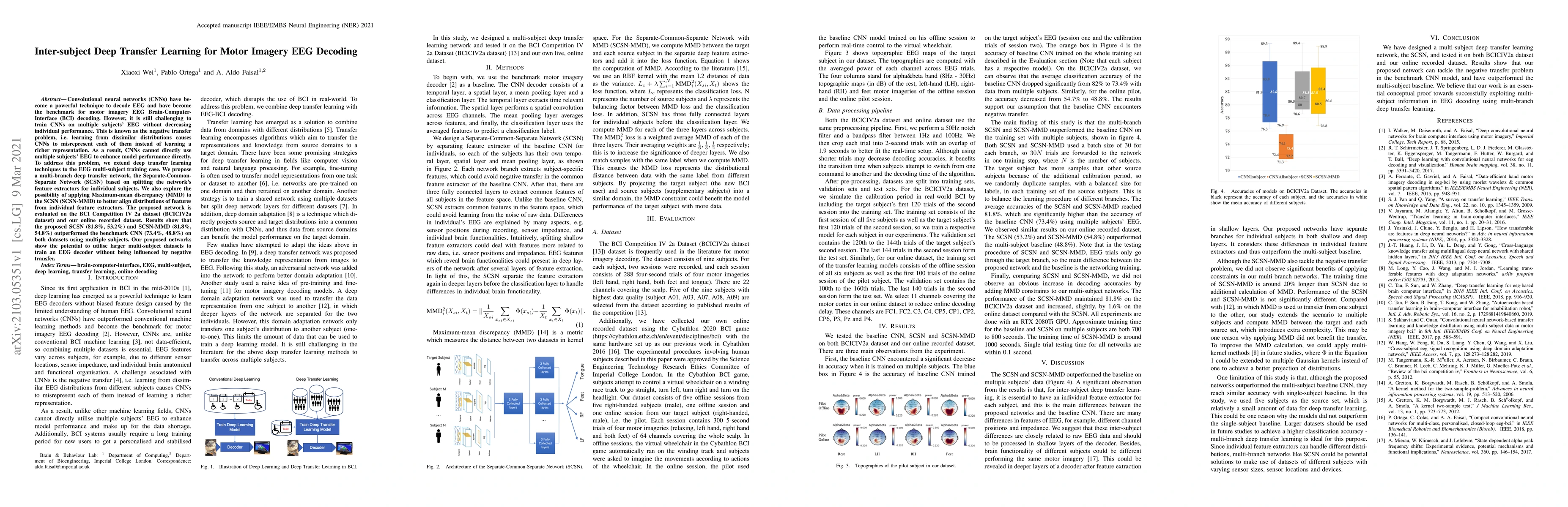 This paper proposes a multi-branch deep transfer learning network, the Separate-Common-Separate Network (SCSN), to address the negative transfer problem in decoding EEG signals for multiple subjects. The SCSN and its enhanced version, SCSN-MMD, outperformed conventional CNNs on two datasets, demonstrating the potential to leverage multi-subject EEG data without performance degradation.
