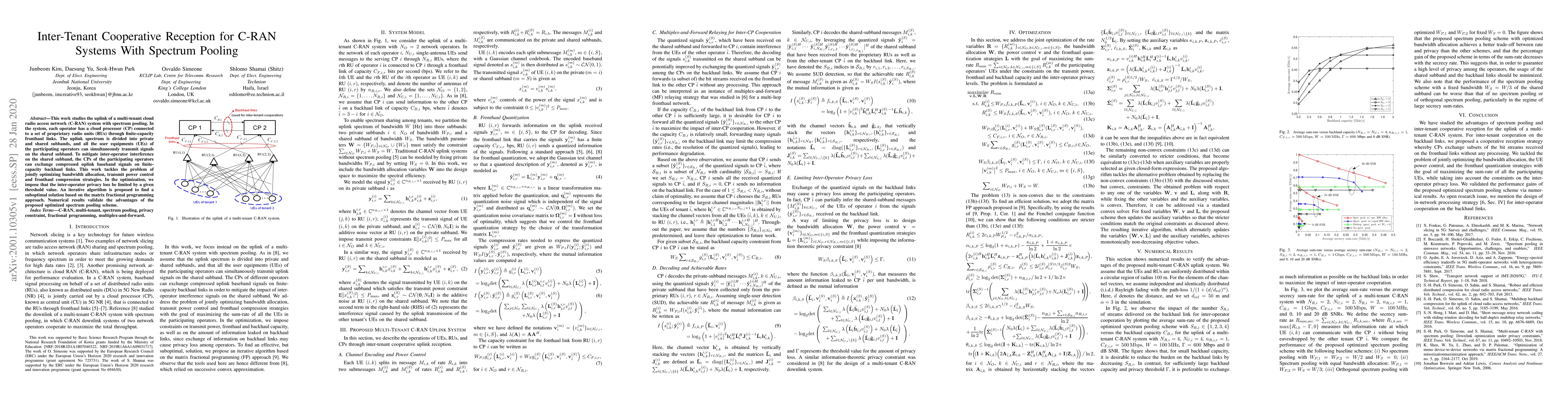 This work studies the uplink of a multi-tenant cloud radio access network (C-RAN) system with spectrum pooling. In the system, each operator has a cloud processor (CP) connected to a set of proprietary radio units (RUs) through finite-capacity fronthaul links. The uplink spectrum is divided into private and shared subbands, and all the user equipments (UEs) of the participating operators can simultaneously transmit signals on the shared subband. To mitigate inter-operator interference on the shared subband, the CPs of the participating operators can exchange compressed uplink baseband signals on finite-capacity backhaul links. This work tackles the problem of jointly optimizing bandwidth allocation, transmit power control and fronthaul compression strategies. In the optimization, we impose that the inter-operator privacy loss be limited by a given threshold value. An iterative algorithm is proposed to find a suboptimal solution based on the matrix fractional programming approach. Numerical results validate the advantages of the proposed optimized spectrum pooling scheme.