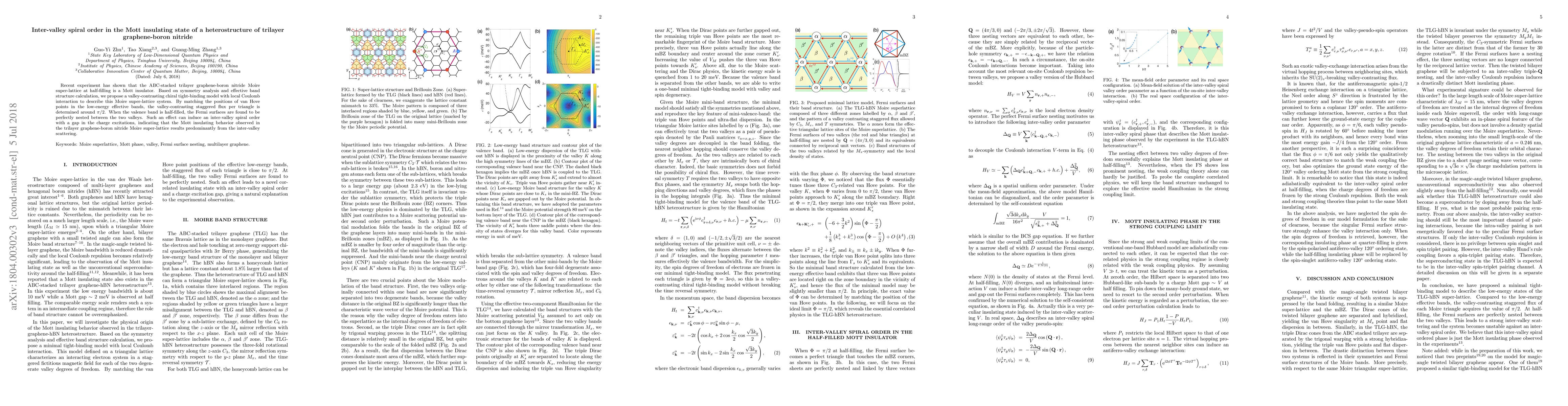 This research proposes a valley-contrasting chiral tight-binding model to describe the Mott insulating state in a trilayer graphene-boron nitride Moiré super-lattice. The study finds that the half-filled valence band induces inter-valley spiral order, suggesting that the Mott insulating behavior is primarily due to inter-valley scattering.