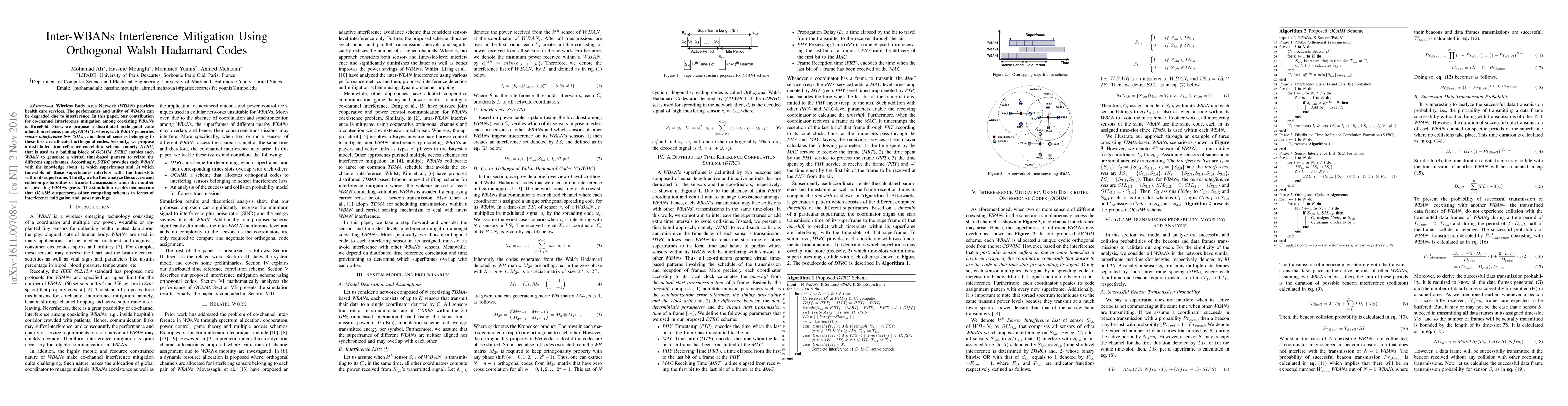 A Wireless Body Area Network (WBAN) provides health care services. The performance and utility of WBANs can be degraded due to interference. In this paper, our contribution for co-channel interference mitigation among coexisting WBANs is threefold. First, we propose a distributed orthogonal code allocation scheme, namely, OCAIM, where, each WBAN generates sensor interference lists (SILs), and then all sensors belonging to these lists are allocated orthogonal codes. Secondly, we propose a distributed time reference correlation scheme, namely, DTRC, that is used as a building block of OCAIM. DTRC enables eachWBAN to generate a virtual time-based pattern to relate the different superframes. Accordingly, DTRC provides each WBAN with the knowledge about, 1) which superframes and, 2) which time-slots of those superframes interfere with the time-slots within its superframe. Thirdly, we further analyze the success and collision probabilities of frames transmissions when the number of coexisting WBANs grows. The simulation results demonstrate that OCAIM outperforms other competing schemes in terms of interference mitigation and power savings.