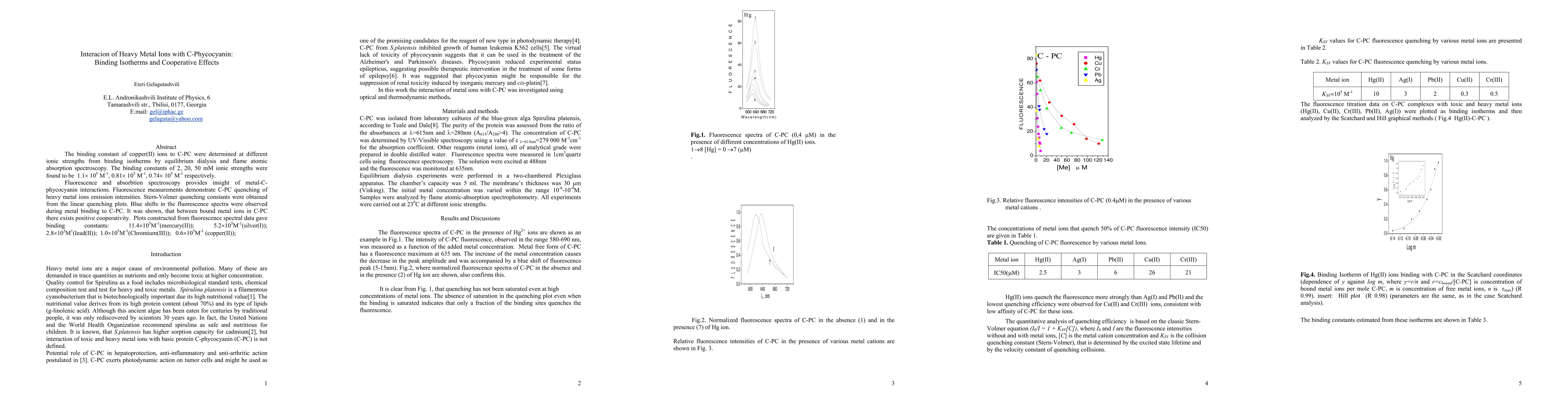 The binding constant of copper(II) ions to C-PC were determined at different ionic strengths from binding isotherms by equilibrium dialysis and flame atomic absorption spectroscopy. Fluorescence and absorbtion spectroscopy provides insight of metal-C-phycocyanin interactions. Fluorescence measurements demonstrate C-PC quenching of heavy metal ions emission intensities. Stern-Volmer quenching constants were obtained from the linear quenching plots. Blue shifts in the fluorescence spectra were observed during metal binding to C-PC. It was shown, that between bound metal ions in C-PC there exists positive cooperativity.