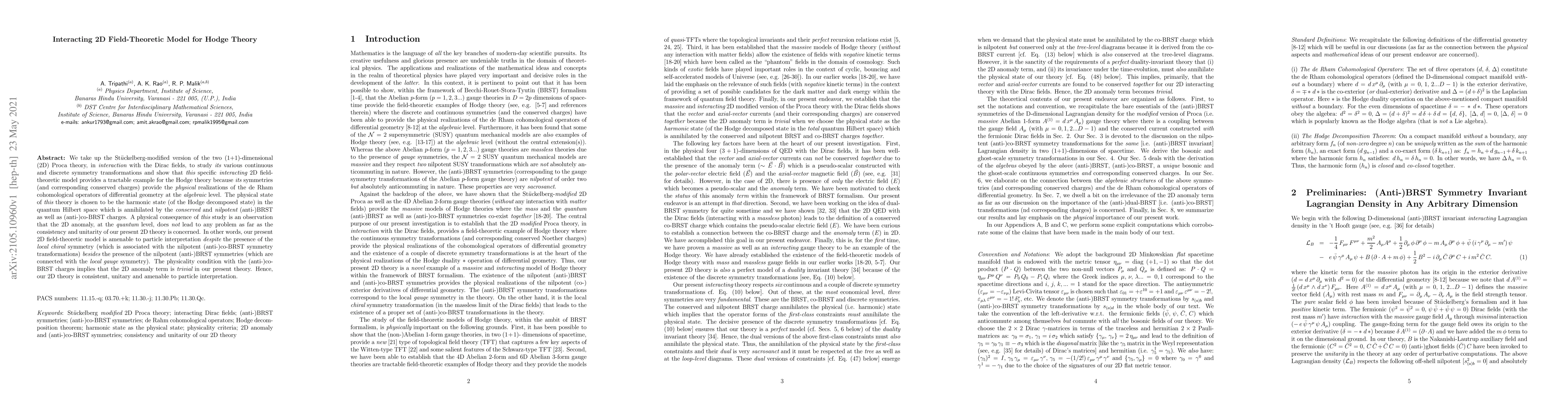 This paper explores an interacting 2D field-theoretic model based on the Stückelberg-modified Proca theory coupled with Dirac fields, demonstrating its relevance to Hodge theory through symmetry transformations and conserved charges. The model is shown to be consistent, unitary, and suitable for particle interpretation despite the presence of 2D anomalies.