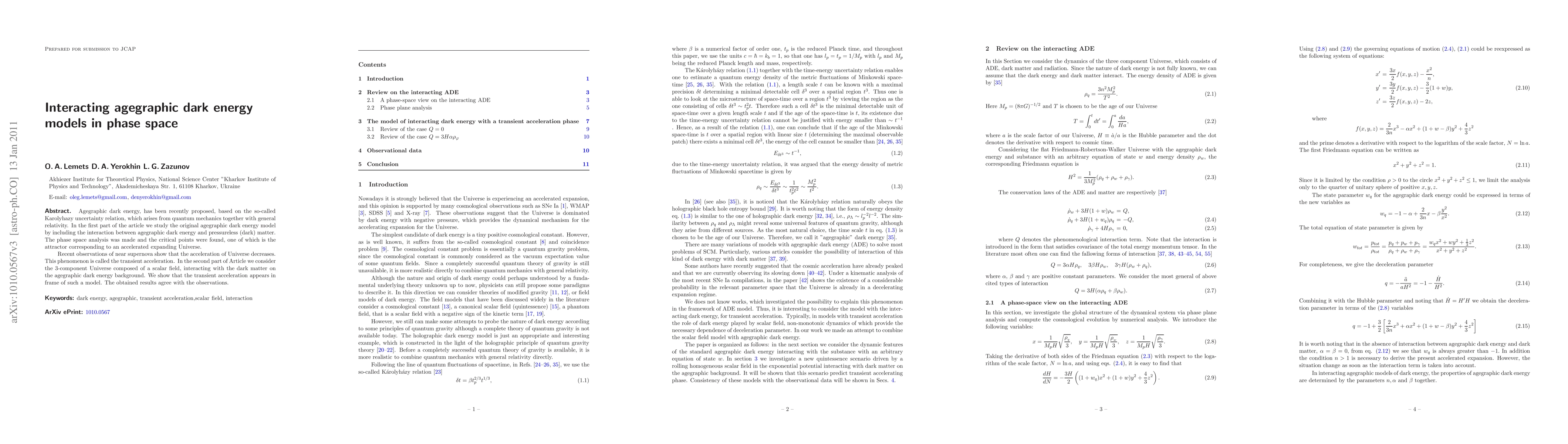 Agegraphic dark energy, has been recently proposed, based on the so-called Karolyhazy uncertainty relation, which arises from quantum mechanics together with general relativity. In the first part of the article we study the original agegraphic dark energy model by including the interaction between agegraphic dark energy and pressureless (dark) matter. The phase space analysis was made and the critical points were found, one of which is the attractor corresponding to an accelerated expanding Universe. Recent observations of near supernova show that the acceleration of Universe decreases. This phenomenon is called the transient acceleration. In the second part of Article we consider the 3-component Universe composed of a scalar field, interacting with the dark matter on the agegraphic dark energy background. We show that the transient acceleration appears in frame of such a model. The obtained results agree with the observations.