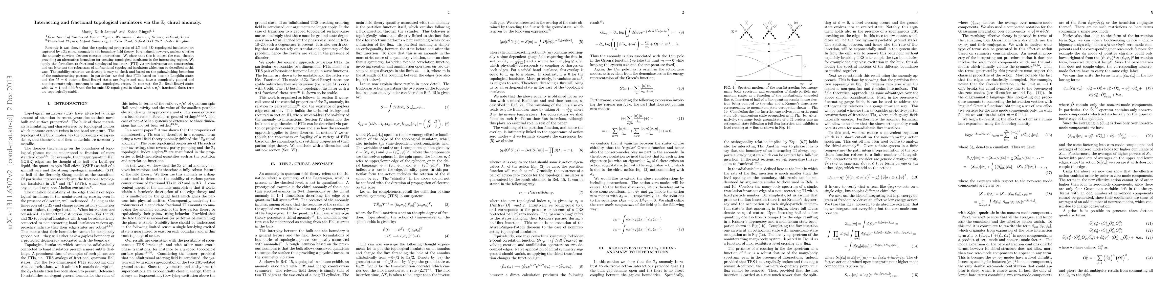 This paper demonstrates that the $\mathbb{Z}_2$ chiral anomaly persists in interacting topological insulators, providing a new framework for studying these materials. It also applies this framework to fractional topological insulators, finding that while some, like the bosonic Laughlin states, are fragile, others, such as $\mathbb{Z}_{k}$ Read-Rezayi states and a $3D$ topological insulator with a $\pi/4$ fractional theta-term, are topologically stable.