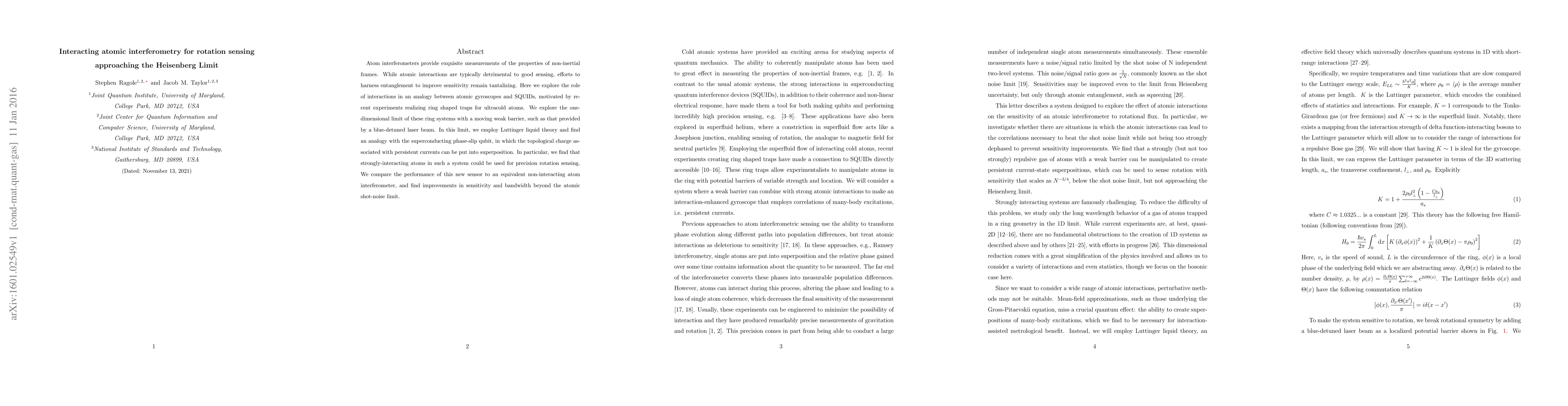 Atom interferometers provide exquisite measurements of the properties of non-inertial frames. While atomic interactions are typically detrimental to good sensing, efforts to harness entanglement to improve sensitivity remain tantalizing. Here we explore the role of interactions in an analogy between atomic gyroscopes and SQUIDs, motivated by recent experiments realizing ring shaped traps for ultracold atoms. We explore the one-dimensional limit of these ring systems with a moving weak barrier, such as that provided by a blue-detuned laser beam. In this limit, we employ Luttinger liquid theory and find an analogy with the superconducting phase-slip qubit, in which the topological charge associated with persistent currents can be put into superposition. In particular, we find that strongly-interacting atoms in such a system could be used for precision rotation sensing. We compare the performance of this new sensor to an equivalent non-interacting atom interferometer, and find improvements in sensitivity and bandwidth beyond the atomic shot-noise limit.