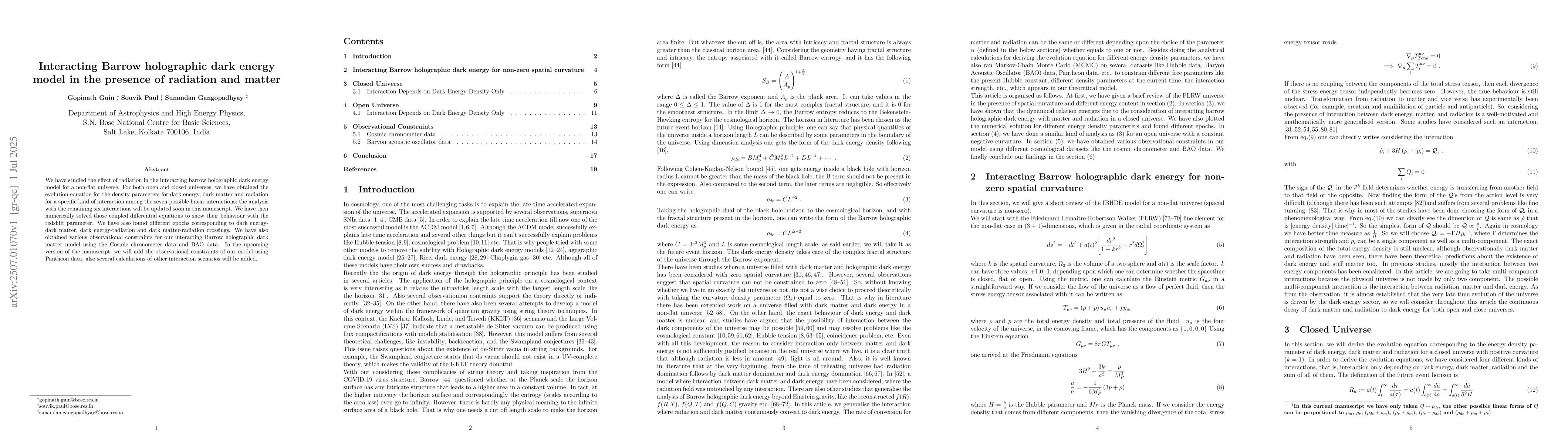 We have studied the effect of radiation in the interacting barrow holographic dark energy model for a non-flat universe. For both open and closed universes, we have obtained the evolution equation for the density parameters for dark energy, dark matter and radiation for a specific kind of interaction among the seven possible linear interactions; the analysis with the remaining six interactions will be updated soon in this manuscript. We have then numerically solved those coupled differential equations to show their behaviour with the redshift parameter. We have also found different epochs corresponding to dark energy-dark matter, dark energy-radiation and dark matter-radiation crossings. We have also obtained various observational constraints for our interacting Barrow holographic dark matter model using the Cosmic chronometer data and BAO data. In the upcoming version of the manuscript, we will add the observational constraints of our model using Pantheon data, also several calculations of other interaction scenarios will be added.