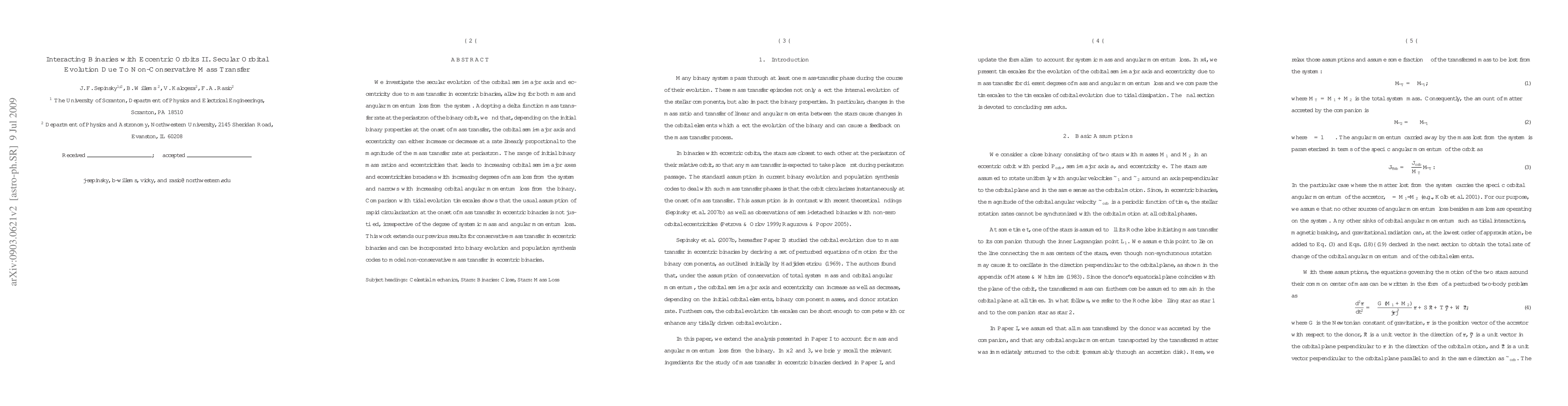 This paper examines the secular evolution of orbital semi-major axis and eccentricity in eccentric binaries undergoing mass transfer, considering both mass and angular momentum loss. It finds that the orbital parameters can increase or decrease depending on initial conditions, challenging the assumption of rapid circularization during mass transfer.