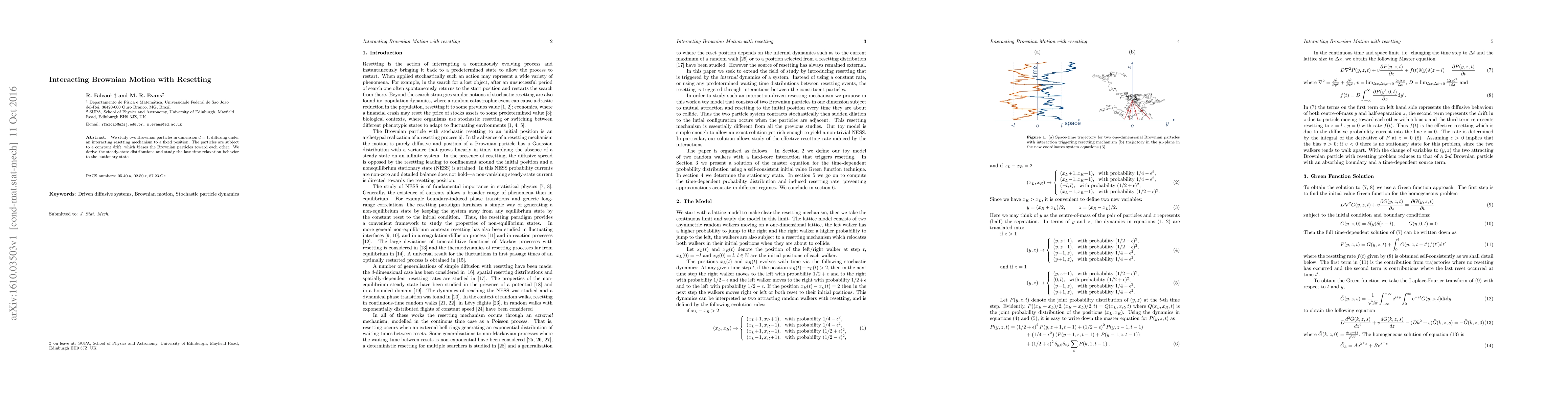 We study two Brownian particles in dimension $d=1$, diffusing under an interacting resetting mechanism to a fixed position. The particles are subject to a constant drift, which biases the Brownian particles toward each other. We derive the steady-state distributions and study the late time relaxation behavior to the stationary state.