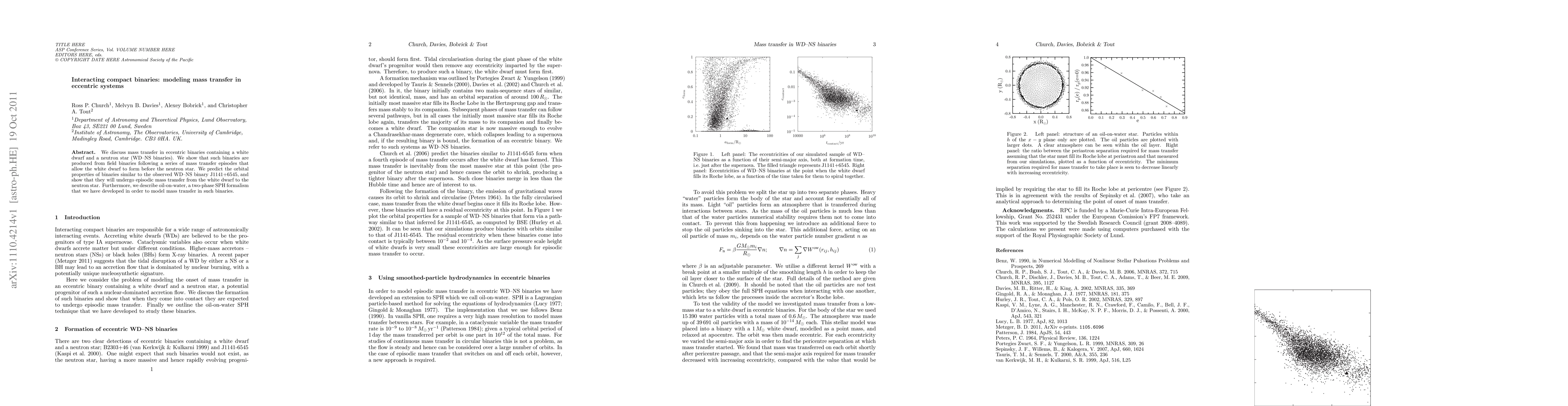 We discuss mass transfer in eccentric binaries containing a white dwarf and a neutron star (WD--NS binaries). We show that such binaries are produced from field binaries following a series of mass transfer episodes that allow the white dwarf to form before the neutron star. We predict the orbital properties of binaries similar to the observed WD--NS binary J1141+6545, and show that they will undergo episodic mass transfer from the white dwarf to the neutron star. Furthermore, we describe oil-on-water, a two-phase SPH formalism that we have developed in order to model mass transfer in such binaries.