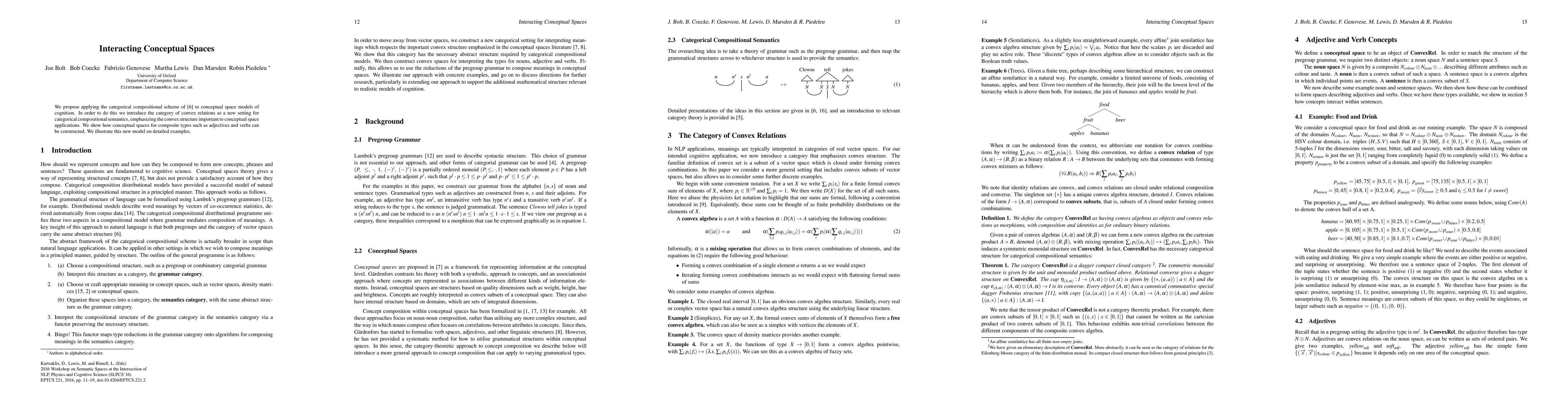We propose applying the categorical compositional scheme of [6] to conceptual space models of cognition. In order to do this we introduce the category of convex relations as a new setting for categorical compositional semantics, emphasizing the convex structure important to conceptual space applications. We show how conceptual spaces for composite types such as adjectives and verbs can be constructed. We illustrate this new model on detailed examples.