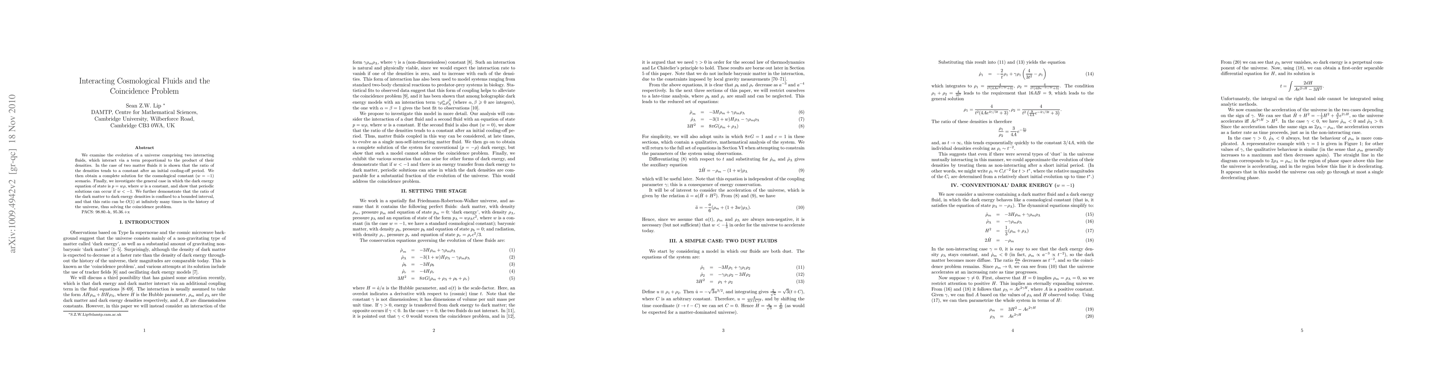 This paper explores the evolution of a universe with two interacting cosmological fluids, showing that their density ratio stabilizes over time. It proposes a solution to the coincidence problem by demonstrating periodic solutions for dark energy with a negative equation of state, leading to the dark matter and dark energy densities being comparable at multiple points in the universe's history.