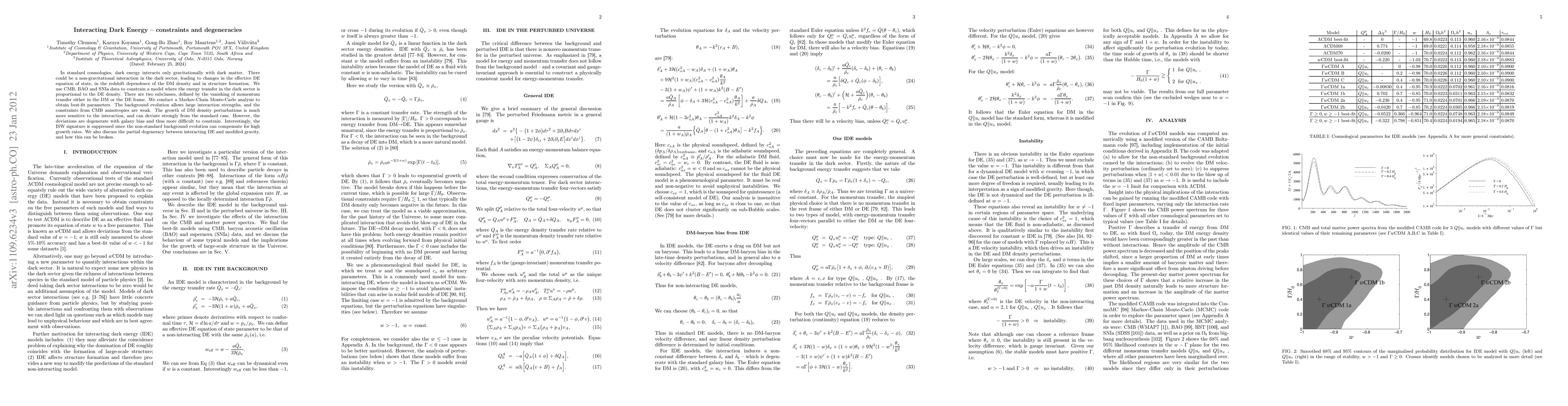 This paper investigates a model of interacting dark energy (DE) where non-gravitational interactions alter the DE equation of state and dark matter (DM) density, using CMB, BAO, and SNIa data. The analysis reveals that while background evolution permits strong interactions, constraints from CMB anisotropies are weak, and deviations from standard models are degenerate with galaxy bias.