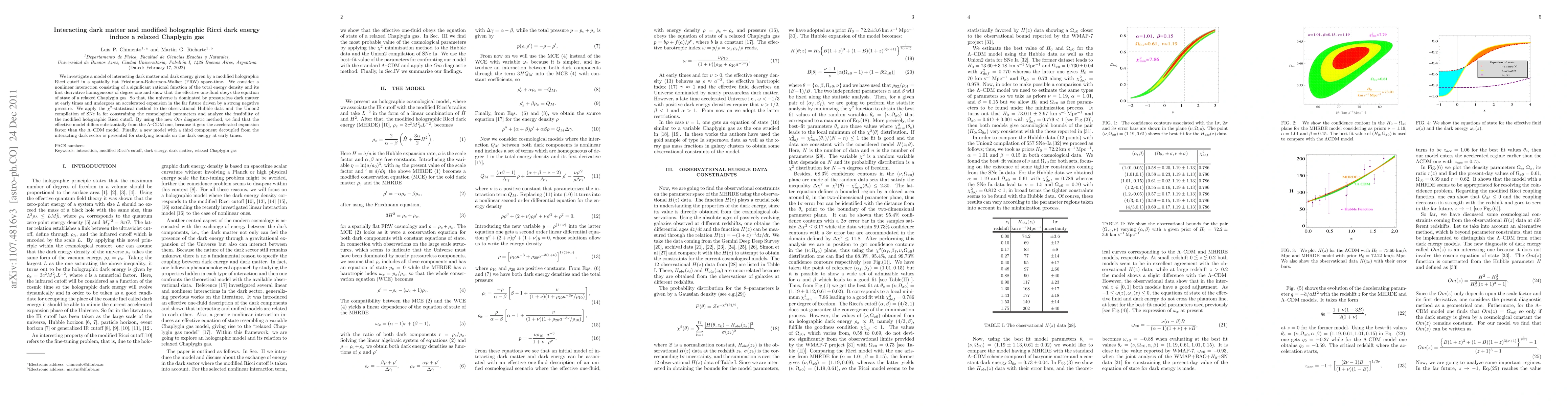 We investigate a model of interacting dark matter and dark energy given by a modified holographic Ricci cutoff in a spatially flat Friedmann-Robertson-Walker (FRW) space-time. We consider a nonlinear interaction consisting of a significant rational function of the total energy density and its first derivative homogeneous of degree one and show that the effective one-fluid obeys the equation of state of a relaxed Chaplygin gas. So that, the universe is dominated by pressureless dark matter at early times and undergoes an accelerated expansion in the far future driven by a strong negative pressure. We apply the $\chi^{2}$-statistical method to the observational Hubble data and the Union2 compilation of SNe Ia for constraining the cosmological parameters and analyze the feasibility of the modified holographic Ricci cutoff. By using the new $Om$ diagnostic method, we find that the effective model differs substantially from the $\Lambda$--CDM one, because it gets the accelerated expansion faster than the $\Lambda$--CDM model. Finally, a new model with a third component decoupled from the interacting dark sector is presented for studying bounds on the dark energy at early times.