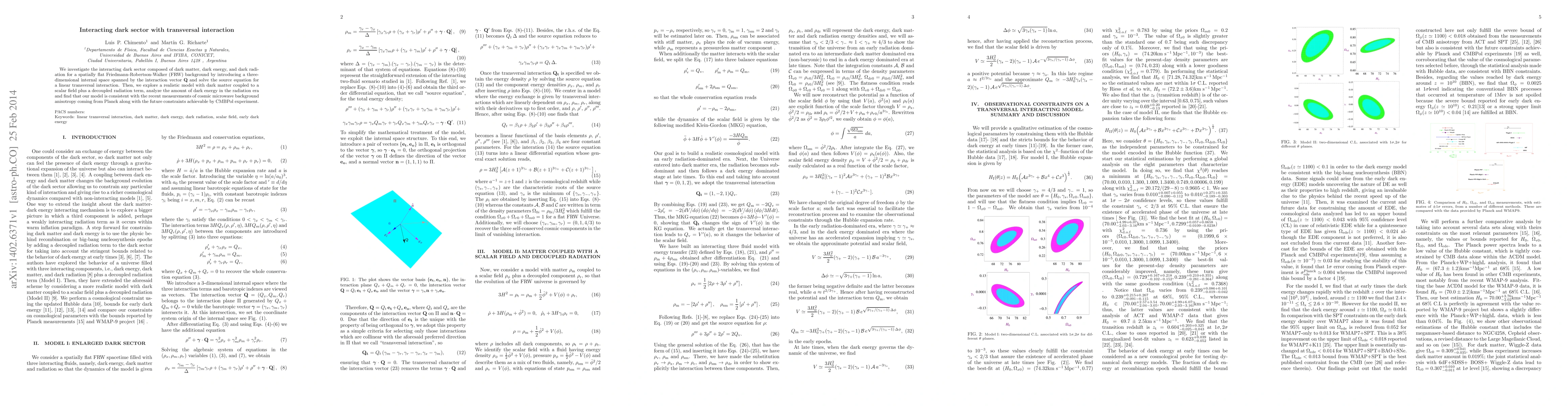 This paper explores an interacting dark sector with dark matter, dark energy, and dark radiation in a flat FRW universe, introducing a transversal interaction vector. It models dark matter coupled to a scalar field and finds consistency with recent cosmic microwave background measurements and future CMBPol constraints.