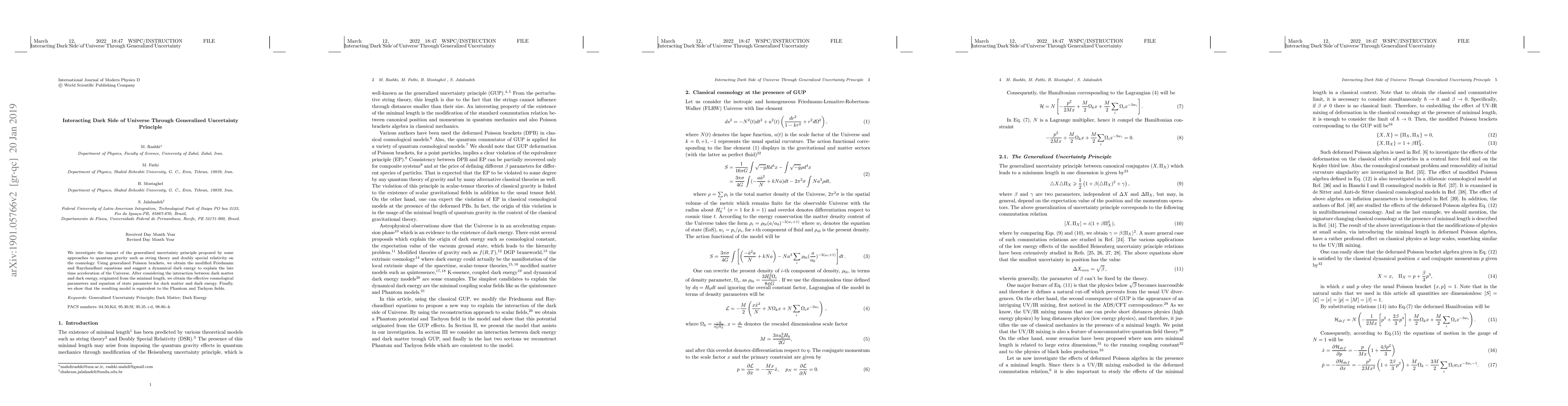 We investigate the impact of the generalized uncertainty principle proposed by some approaches to quantum gravity such as string theory and doubly special relativity on the cosmology. Using generalized Poisson brackets, we obtain the modified Friedmann and Raychaudhuri equations and suggest a dynamical dark energy to explain the late time acceleration of the Universe. After considering the interaction between dark matter and dark energy, originated from the minimal length, we obtain the effective cosmological parameters and equation of state parameter for dark matter and dark energy. Finally, we show that the resulting model is equivalent to the Phantom and Tachyon fields.