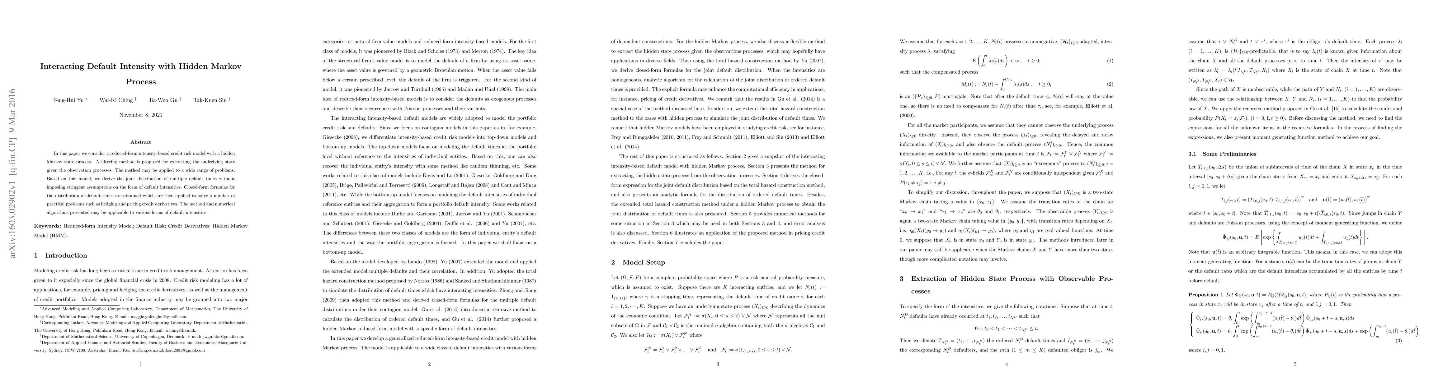 In this paper we consider a reduced-form intensity-based credit risk model with a hidden Markov state process. A filtering method is proposed for extracting the underlying state given the observation processes. The method may be applied to a wide range of problems. Based on this model, we derive the joint distribution of multiple default times without imposing stringent assumptions on the form of default intensities. Closed-form formulas for the distribution of default times are obtained which are then applied to solve a number of practical problems such as hedging and pricing credit derivatives. The method and numerical algorithms presented may be applicable to various forms of default intensities.