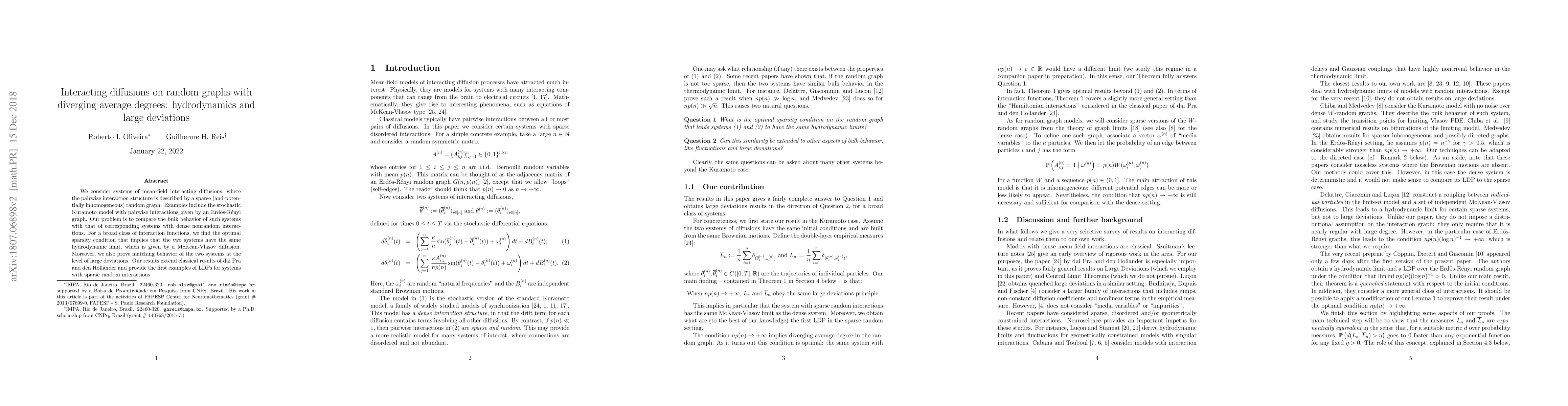 This paper investigates the hydrodynamic behavior and large deviations of interacting diffusions on sparse random graphs, comparing them to systems with dense nonrandom interactions. It establishes the optimal sparsity condition for equivalence in hydrodynamic limits and proves matching large deviation principles.