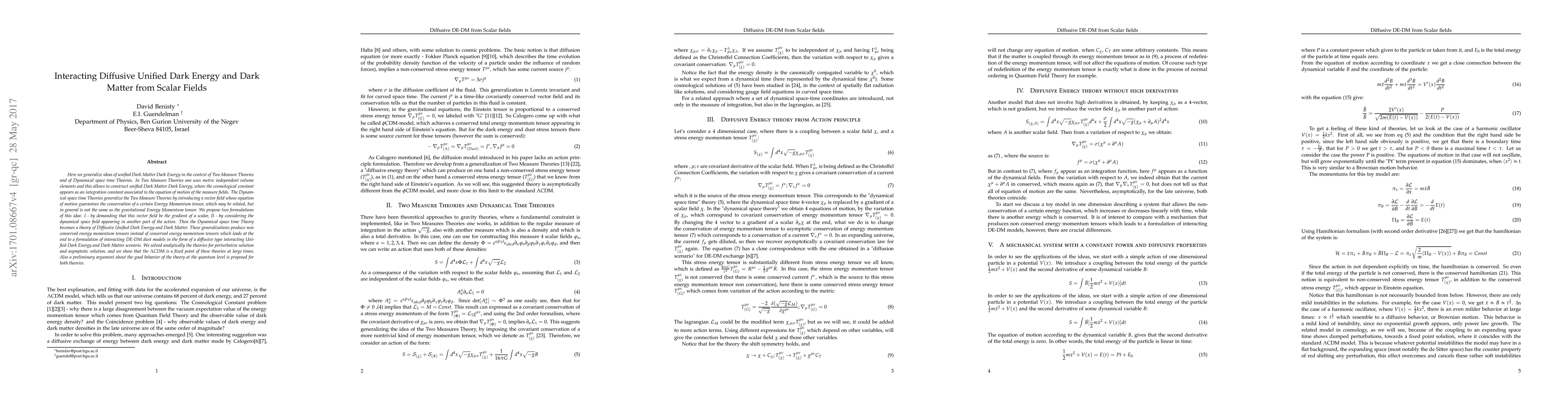 This paper generalizes unified Dark Matter and Dark Energy theories using Two Measure Theories and Dynamical space time Theories, proposing a diffusive unified model with interacting Dark Energy and Dark Matter. Analytical solutions show that $\Lambda$CDM emerges as a long-term behavior, with preliminary quantum behavior arguments supporting the theories.