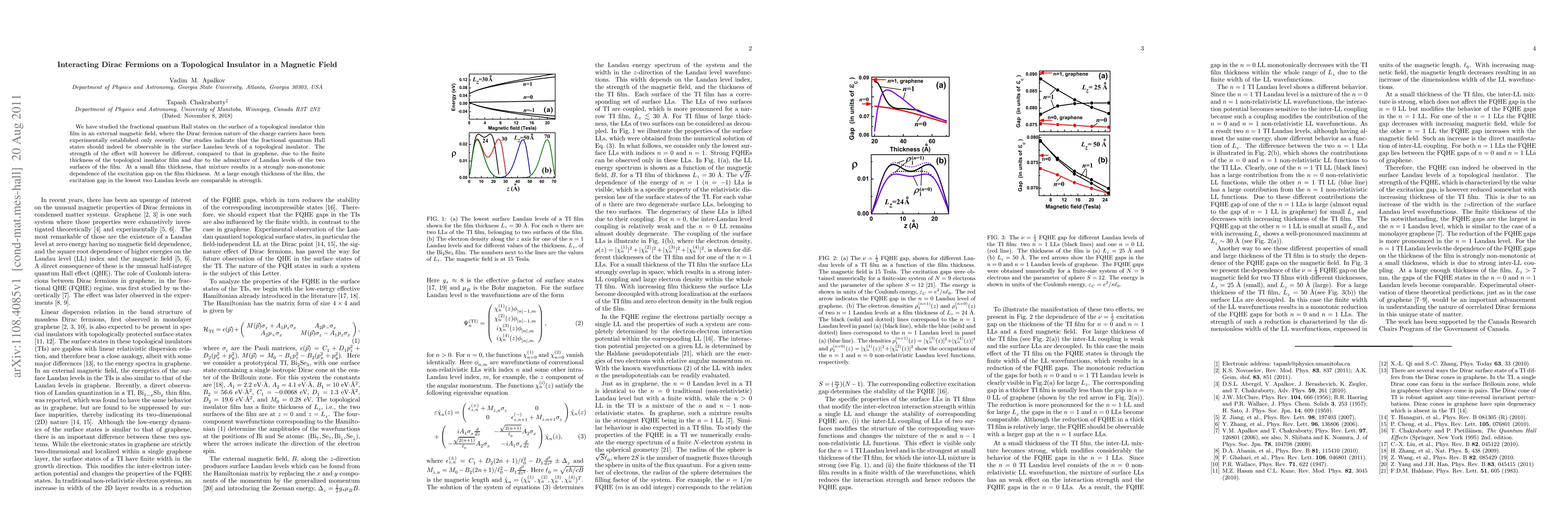 We have studied the fractional quantum Hall states on the surface of a topological insulator thin film in an external magnetic field, where the Dirac fermion nature of the charge carriers have been experimentally established only recently. Our studies indicate that the fractional quantum Hall states should indeed be observable in the surface Landau levels of a topological insulator. The strength of the effect will however be different, compared to that in graphene, due to the finite thickness of the topological insulator film and due to the admixture of Landau levels of the two surfaces of the film. At a small film thickness, that mixture results in a strongly non-monotonic dependence of the excitation gap on the film thickness. At a large enough thickness of the film, the excitation gap in the lowest two Landau levels are comparable in strength.