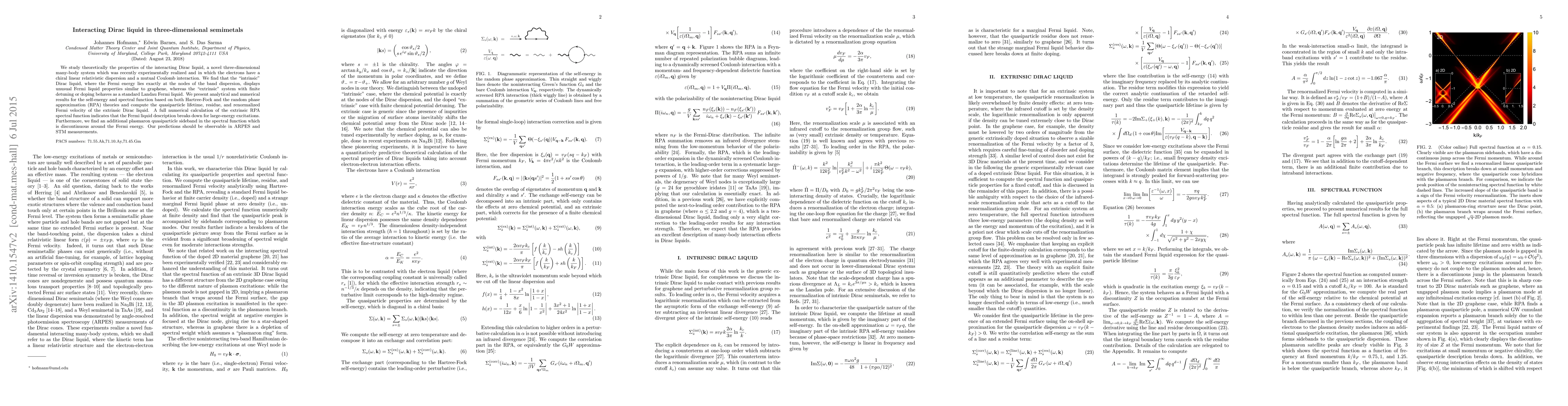 This paper investigates the properties of interacting Dirac liquids in three-dimensional semimetals, revealing unusual Fermi liquid behavior in intrinsic systems and standard Landau Fermi liquid behavior in extrinsic ones. The study predicts observable phenomena in ARPES and STM measurements, including a plasmaron quasiparticle sideband.