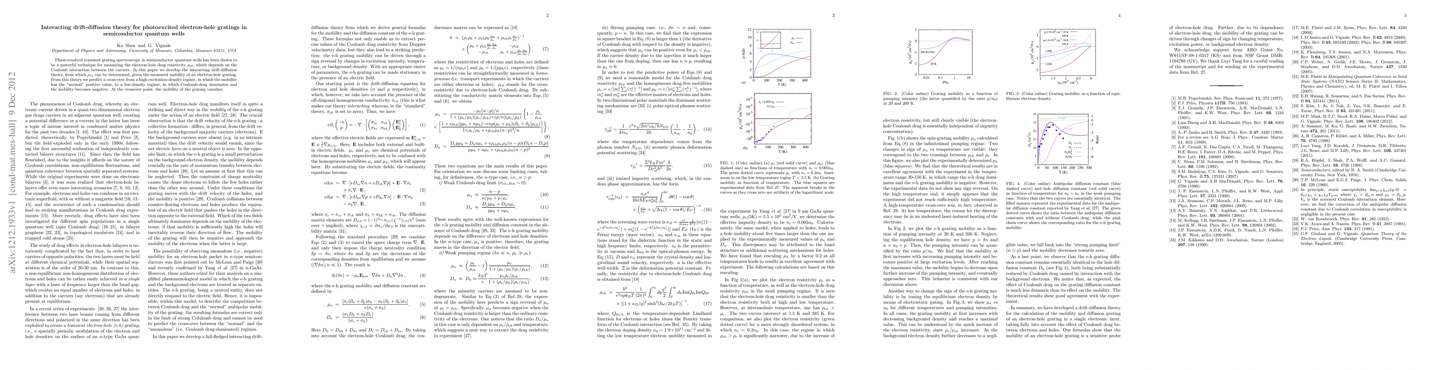 Phase-resolved transient grating spectroscopy in semiconductor quantum wells has been shown to be a powerful technique for measuring the electron-hole drag resistivity $\rho_{eh}$, which depends on the Coulomb interaction between the carriers. In this paper we develop the interacting drift-diffusion theory, from which $\rho_{eh}$ can be determined, given the measured mobility of an electron-hole grating. From this theory we predict a cross-over from a high-excitation-density regime, in which the mobility has the "normal" positive value, to a low-density regime, in which Coulomb-drag dominates and the mobility becomes negative. At the crossover point, the mobility of the grating vanishes.