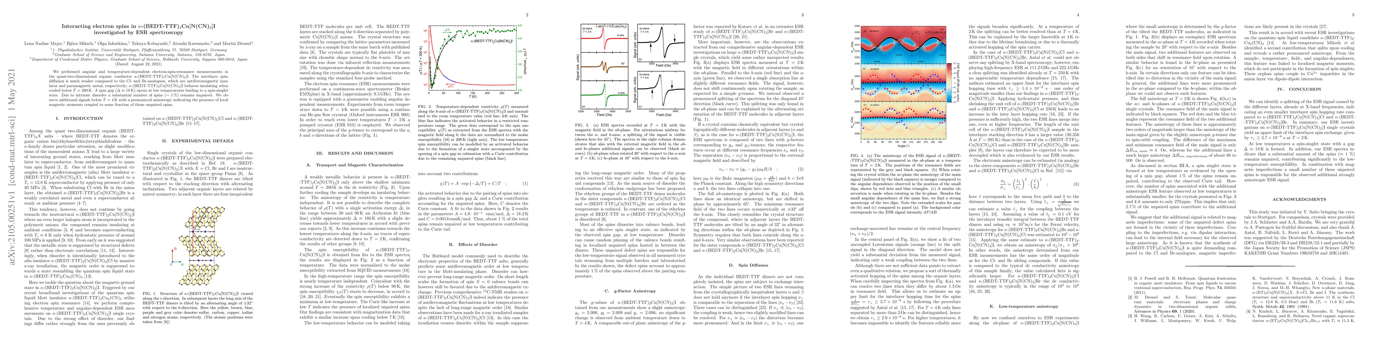 This paper investigates the electron spins in the organic conductor $\kappa$-(BEDT-TTF)$_2$Cu[N(CN)$_2$]I using ESR spectroscopy, finding a weak interlayer spin-diffusion and an insulating behavior below 200 K, with a spin gap and intrinsic disorder causing some spins to remain unpaired. Additional anisotropic signals below 4 K suggest local magnetic moments coupled with unpaired spins.