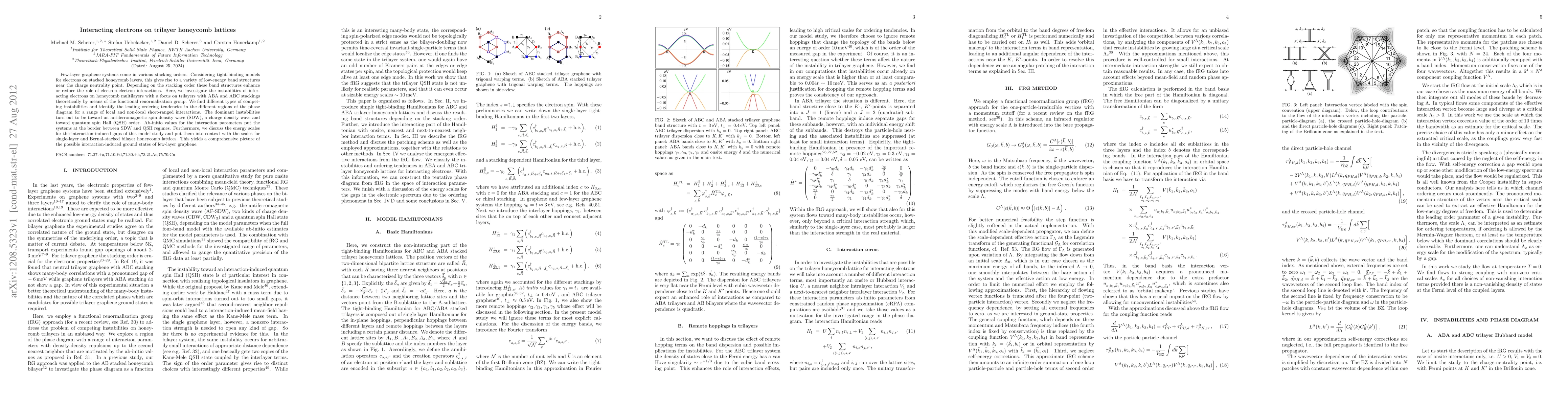 Researchers studied how electrons interact in trilayer graphene and found that they can form different types of ordered states, including antiferromagnetic spin-density waves, charge density waves, and quantum spin Hall order, depending on the stacking order.