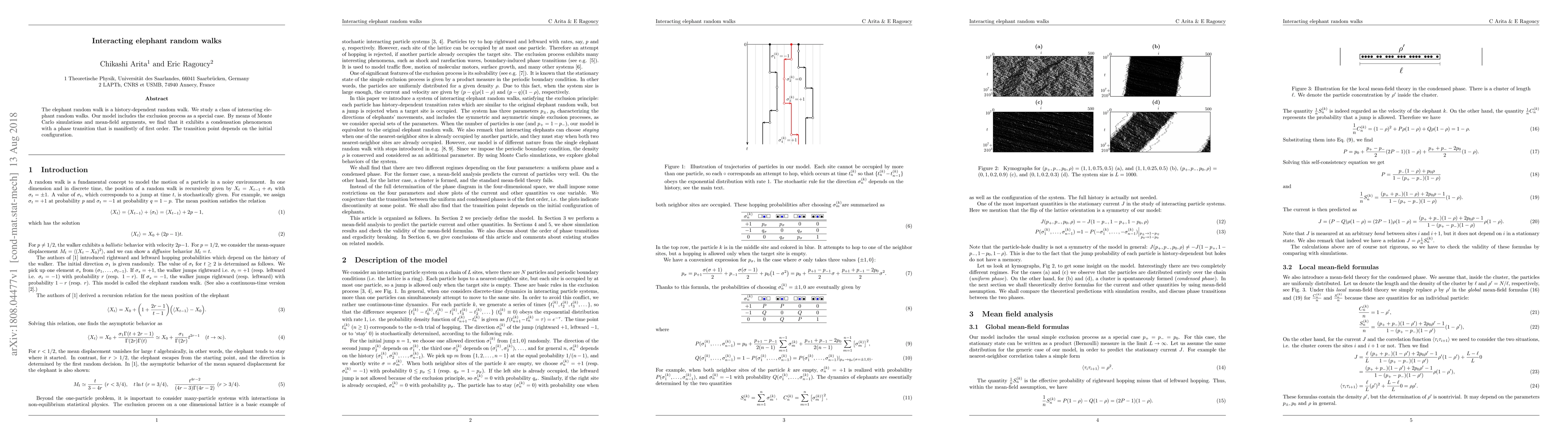 Summary: This paper explores interacting elephant random walks, a type of history-dependent random walk, and identifies a condensation phenomenon with a first-order phase transition, which varies based on the initial configuration, using Monte Carlo simulations and mean-field analysis.
