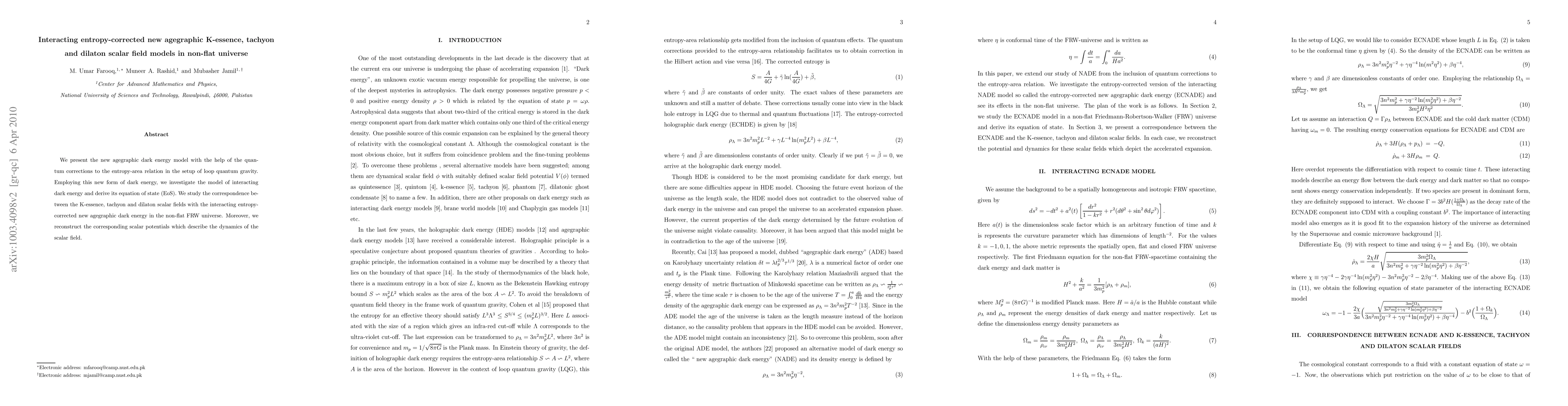 We present the new agegraphic dark energy model by introducing the quantum corrections to the entropy-area relation in the setup of loop quantum gravity. Employing this new form of dark energy, we investigate the model of interacting dark energy and derive its equation of state. We study the correspondence between the tachyon, K-essence and dilaton scalar field models with the interacting entropy-corrected new agegraphic dark energy model in the non-flat FRW universe. Moreover, we reconstruct the corresponding scalar potentials which describe the dynamics of the scalar field models.