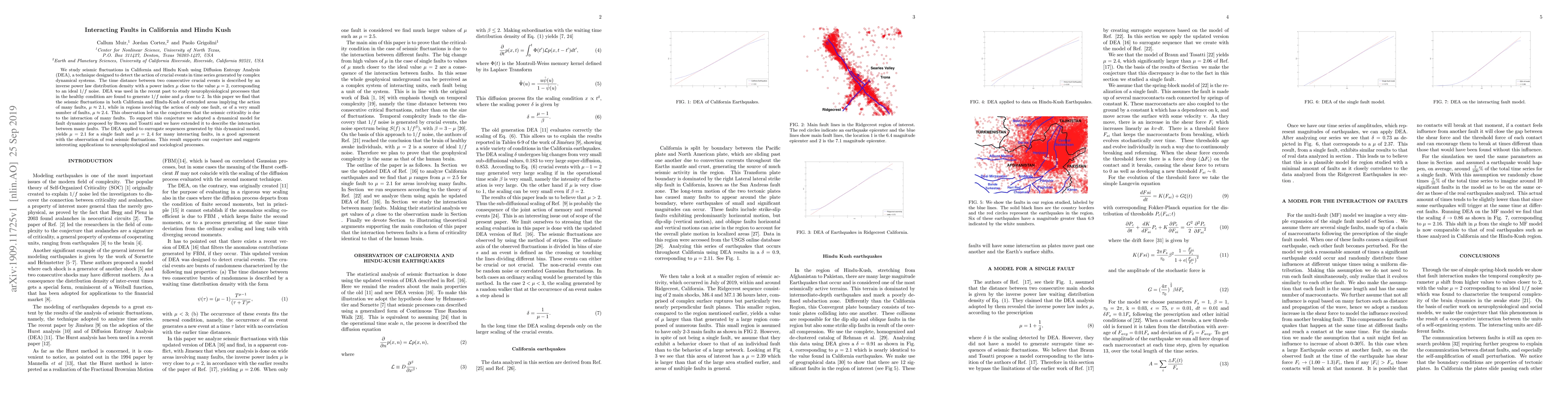 We study seismic fluctuations in California and Hindu Kush using Diffusion Entropy Analysis (DEA), a technique designed to detect the action of crucial events in time series generated by complex dynamical systems. The time distance between two consecutive crucial events is described by an inverse power law distribution density with a power index $\mu$ close to the value $\mu = 2$, corresponding to an ideal $1/f$ noise. DEA was used in the recent past to study neurophysiological processes that in the healthy condition are found to generate $1/f$ noise and $\mu$ close to $2$. In this paper we find that the seismic fluctuations in both California and Hindu-Kush of extended areas implying the action of many faults, $\mu \approx 2.1$, while in regions involving the action of only one fault, or of a very small number of faults, $\mu \approx 2.4$. This observation led us the conjectures that the seismic criticality is due to the interaction of many faults. To support this conjecture we adopted a dynamical model for fault dynamics proposed by Brown and Tosatti and we have extended it to describe the interaction between many faults. The DEA applied to surrogate sequences generated by this dynamical model, yields $\mu = 2.1$ for a single fault and $\mu = 2,4$ for many interacting faults, in a good agreement with the observation of real seismic fluctuations. This result supports our conjecture and suggests interesting applications to neurophysiological and sociological processes.