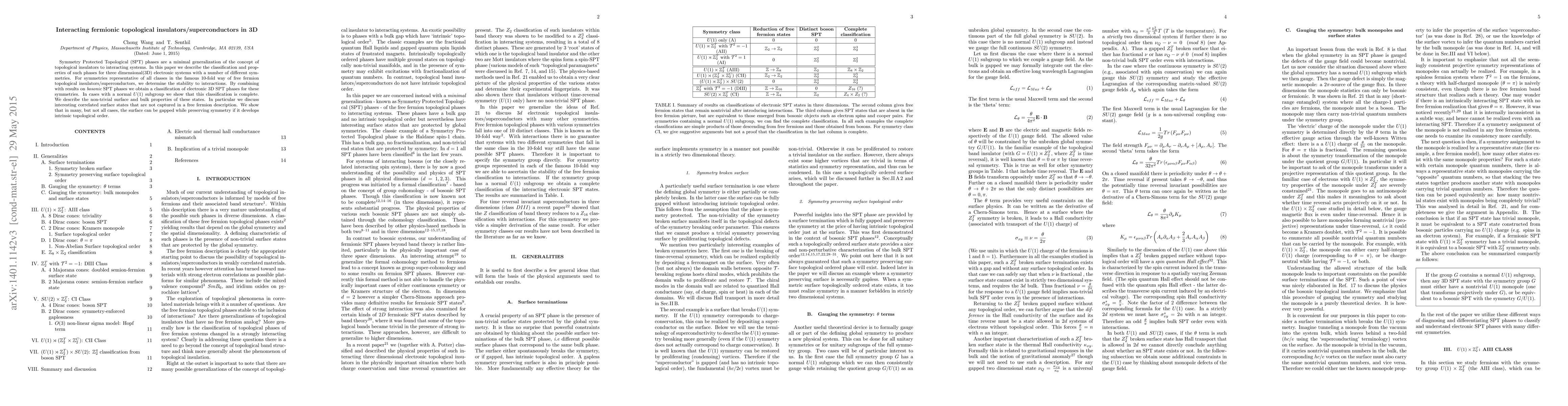 This paper classifies interacting Symmetry Protected Topological (SPT) phases in three-dimensional fermionic systems, determining their stability under interactions and combining results with bosonic SPT phases. It reveals non-trivial correlated surface states and shows that while some surfaces can be gapped, intrinsic topological order may develop.