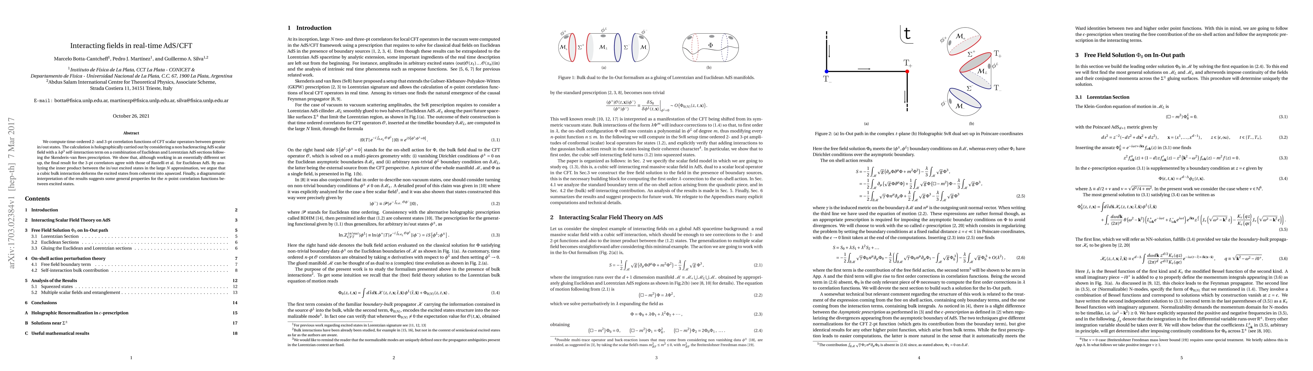We compute time-ordered 2- and 3-pt correlation functions of CFT scalar operators between generic in/out states. The calculation is holographically carried out by considering a non backreacting AdS scalar field with a $\lambda \phi^3$ self-interaction term on a combination of Euclidean and Lorentzian AdS sections following the Skenderis-van Rees prescription. We show that, although working in an essentially different set up, the final result for the 3-pt correlators agree with those of Rastelli et al. for Euclidean AdS. By analyzing the inner product between the in/out excited states in the large $N$ approximation, we argue that a cubic bulk interaction deforms the excited states from coherent into \emph{squeezed}. Finally, a diagrammatic interpretation of the results suggests some general properties for the $n$-point correlation functions between excited states.
