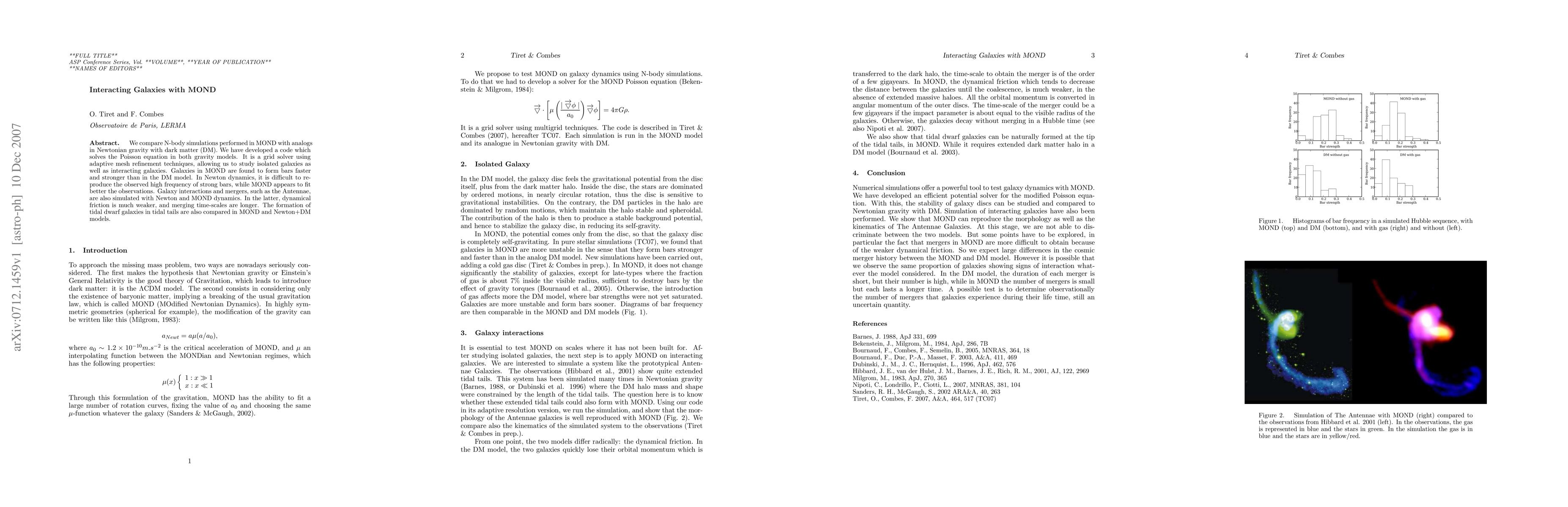 We compare N-body simulations performed in MOND with analogs in Newtonian gravity with dark matter (DM). We have developed a code which solves the Poisson equation in both gravity models. It is a grid solver using adaptive mesh refinement techniques, allowing us to study isolated galaxies as well as interacting galaxies. Galaxies in MOND are found to form bars faster and stronger than in the DM model. In Newton dynamics, it is difficult to reproduce the observed high frequency of strong bars, while MOND appears to fit better the observations. Galaxy interactions and mergers, such as the Antennae, are also simulated with Newton and MOND dynamics. In the latter, dynamical friction is much weaker, and merging time-scales are longer. The formation of tidal dwarf galaxies in tidal tails are also compared in MOND and Newton+DM models.