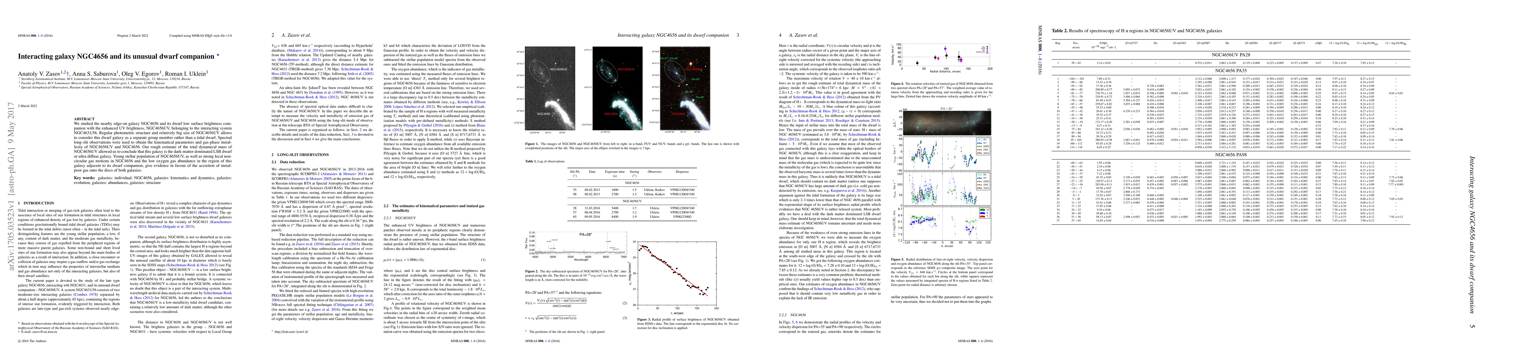We studied the nearby edge-on galaxy NGC4656 and its dwarf low surface brightness companion with the enhanced UV brightness, NGC4656UV, belonging to the interacting system NGC4631/56. Regular photometric structure and relatively big size of NGC4656UV allows to consider this dwarf galaxy as a separate group member rather than a tidal dwarf. Spectral long-slit observations were used to obtain the kinematical parameters and gas-phase metallicity of NGC4656UV and NGC4656. Our rough estimate of the total dynamical mass of NGC4656UV allowed us to conclude that this galaxy is the dark-matter dominated LSB dwarf or ultra diffuse galaxy. Young stellar population of NGC4656UV, as well as strong local non-circular gas motions in NGC4656 and the low oxygen gas abundance in the region of this galaxy adjacent to its dwarf companion, give evidence in favour of the accretion of metal-poor gas onto the discs of both galaxies.