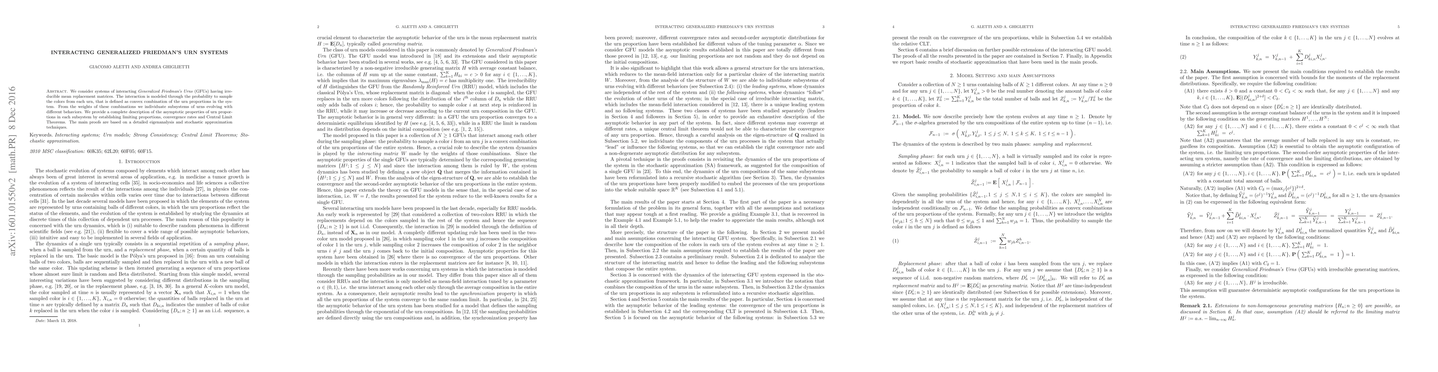 This paper studies interacting Generalized Friedman's Urns with irreducible mean replacement matrices, modeling interactions via convex combinations of urn proportions. It provides asymptotic properties, including limiting proportions, convergence rates, and Central Limit Theorems, using eigenanalysis and stochastic approximation techniques.