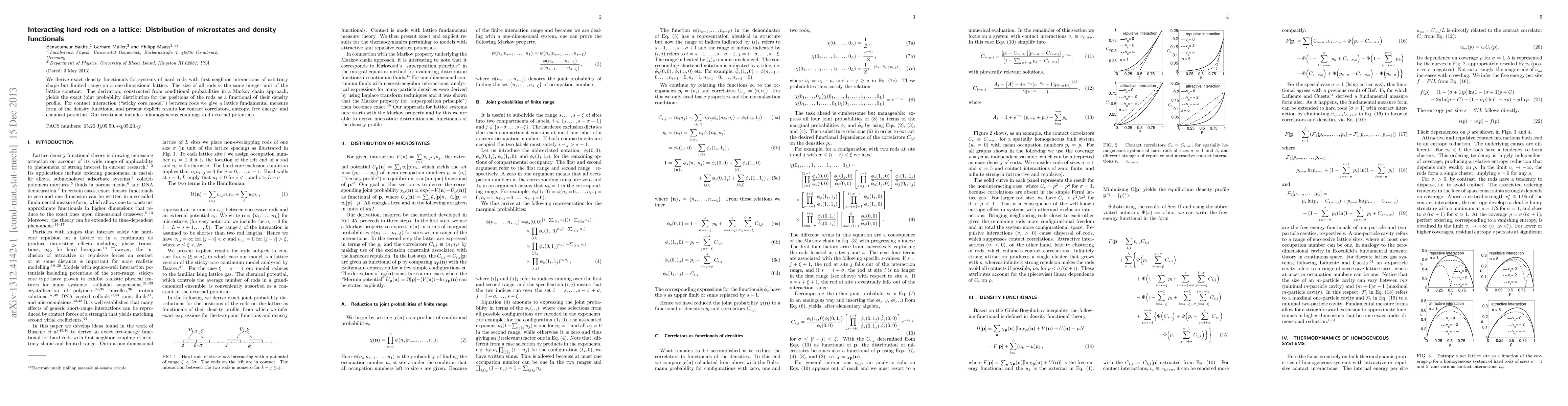 This paper derives exact density functionals for systems of hard rods on a lattice, providing results for contact interaction and external potentials. It offers new insights into the behavior of rod-like particles in one-dimensional environments.