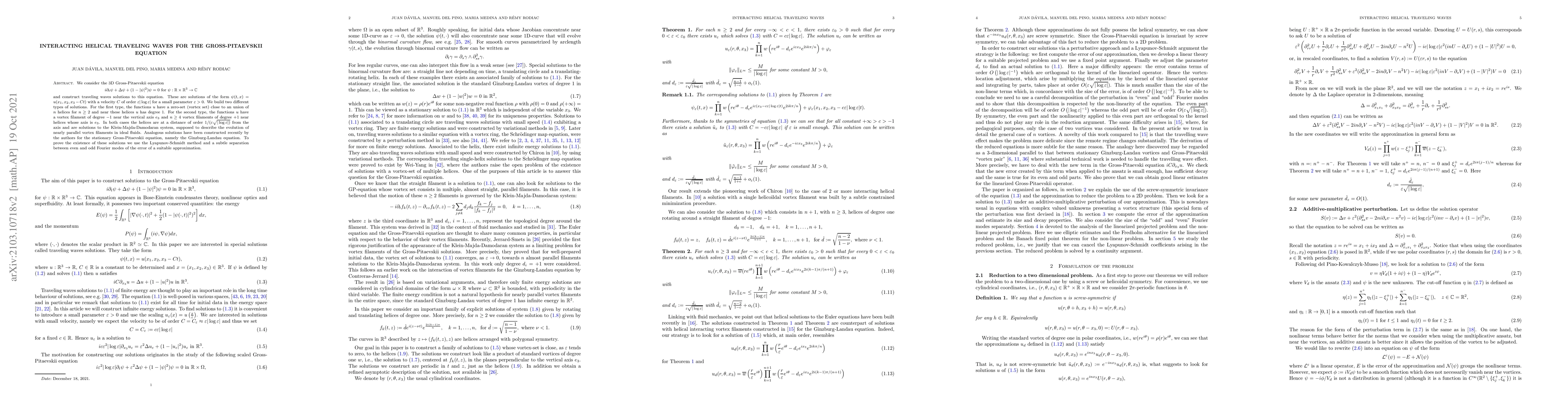 This paper constructs traveling wave solutions for the 3D Gross-Pitaevskii equation, featuring helical structures with vortex sets. The solutions are derived using the Lyapunov-Schmidt method and involve a separation of Fourier modes to prove their existence.