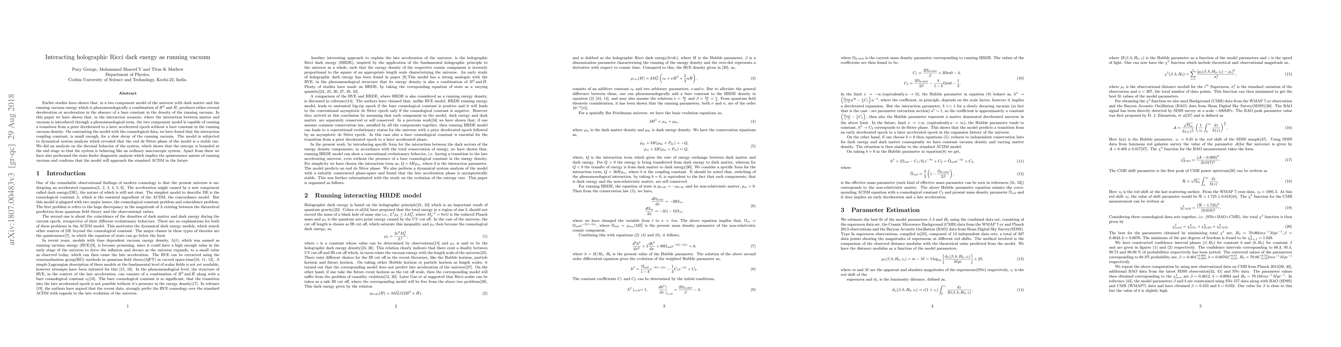 Earlier studies have shown that, in a two component model of the universe with dark matter and the running vacuum energy which is phenomenologically a combination of $H^2$ and $\dot{H},$ produces either eternal deceleration or acceleration in the absence of a bare constant in the density of the running vacuum. In this paper we have shown that, in the interaction scenario, where the interaction between matter and vacuum is introduced through a phenomenological term, the two component model is capable of causing a transition from a prior decelerated to a later accelerated epoch without a bare constant in the running vacuum density. On contrasting the model with the cosmological data, we have found that the interaction coupling constant, is small enough, for a slow decay of the running vacuum. The model is subjected to dynamical system analysis which revealed that the end de Sitter phase of the model is a stable one. We did an analysis on the thermal behavior of the system, which shows that the entropy is bounded at the end stage so that the system is behaving like an ordinary macroscopic system. Apart from these we have also performed the state finder diagnostic analysis which implies the quintessence nature of running vacuum and confirms that the model will approach the standard $\Lambda$CDM in the future.