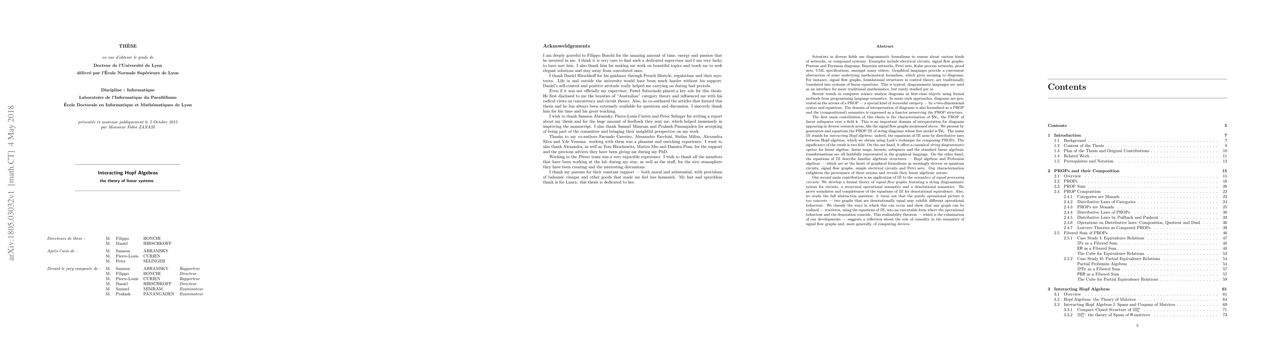 As first main contribution, this thesis characterises the PROP SVk of linear subspaces over a field k - an important domain of interpretation for circuit diagrams appearing in diverse research areas. We present by generators and equations the PROP IH of string diagrams whose free model is SVk. IH stands for interacting Hopf algebras: its equations arise by distributive laws between Hopf algebras, which we obtain using Lack's technique for composing PROPs. The significance of the result is two-fold. First, it offers a canonical diagrammatic syntax for linear algebra: linear maps, kernels, subspaces, etc... are all faithfully represented in the graphical language. Second, the equations of IH describe familiar algebraic structures - Hopf algebras and Frobenius algebras - which are at the heart of graphical formalisms as seemingly diverse as quantum circuits, signal flow graphs, simple electrical circuits and Petri nets. Our characterisation enlightens the provenance of these axioms and reveals their linear algebraic nature. Our second main contribution is an application of IH to the semantics of signal processing circuits. We develop a formal theory of signal flow graphs, featuring a diagrammatic circuit syntax, a structural operational semantics and a denotational semantics. We prove completeness of the equations of IH for denotational equivalence. Also, we study full abstraction: it turns out that the purely operational picture is too concrete - two denotationally equal graphs may exhibit different operational behaviour. We classify the ways in which this can occur and show that any graph can be realised - rewritten, using the equations of IH, into an executable form where the operational behaviour and the denotation coincide. This realisability theorem suggests a reflection about the role of causality in the semantics of signal flow graphs and, more generally, of computing devices.