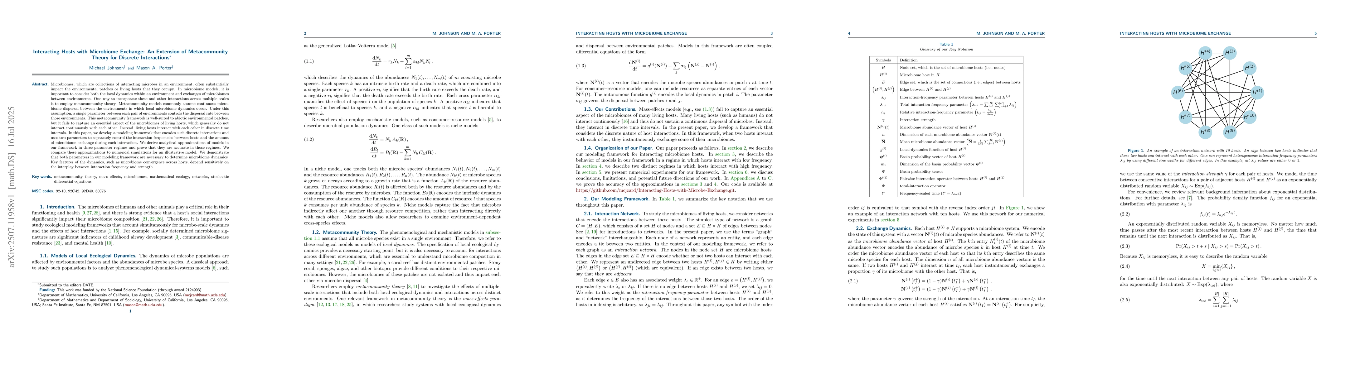 Microbiomes, which are collections of interacting microbes in an environment, often substantially impact the environmental patches or living hosts that they occupy. In microbiome models, it is important to consider both the local dynamics within an environment and exchanges of microbiomes between environments. One way to incorporate these and other interactions across multiple scales is to employ metacommunity theory. Metacommunity models commonly assume continuous microbiome dispersal between the environments in which local microbiome dynamics occur. Under this assumption, a single parameter between each pair of environments controls the dispersal rate between those environments. This metacommunity framework is well-suited to abiotic environmental patches, but it fails to capture an essential aspect of the microbiomes of living hosts, which generally do not interact continuously with each other. Instead, living hosts interact with each other in discrete time intervals. In this paper, we develop a modeling framework that encodes such discrete interactions and uses two parameters to separately control the interaction frequencies between hosts and the amount of microbiome exchange during each interaction. We derive analytical approximations of models in our framework in three parameter regimes and prove that they are accurate in those regimes. We compare these approximations to numerical simulations for an illustrative model. We demonstrate that both parameters in our modeling framework are necessary to determine microbiome dynamics. Key features of the dynamics, such as microbiome convergence across hosts, depend sensitively on the interplay between interaction frequency and strength.