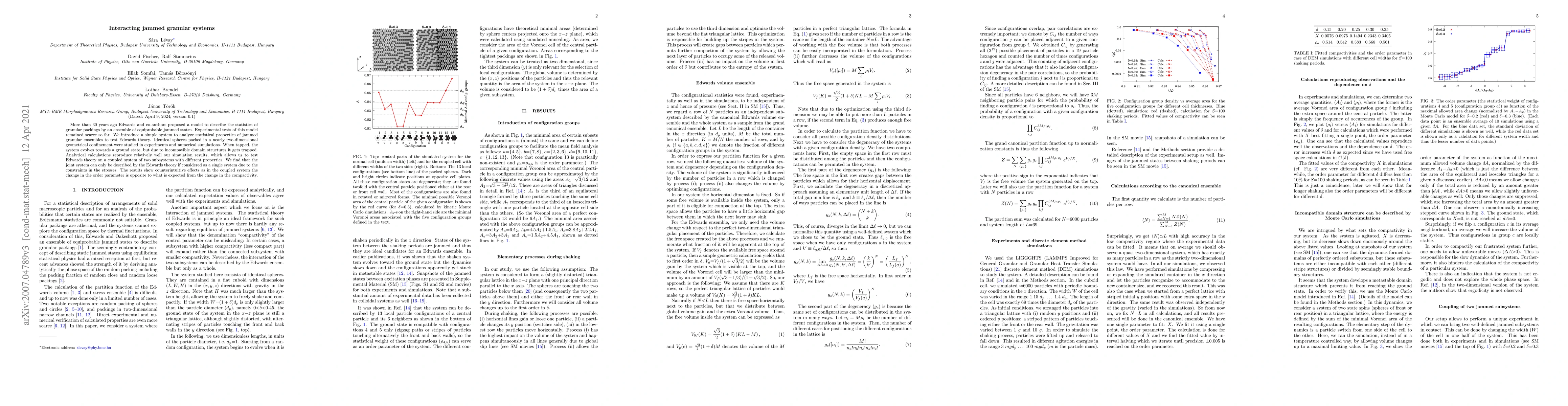 More than 30 years ago Edwards and co-authors proposed a model to describe the statistics of granular packings by an ensemble of equiprobable jammed states. Experimental tests of this model remained scarce so far. We introduce a simple system to analyze statistical properties of jammed granular ensembles to test Edwards theory. Identical spheres packed in a nearly two-dimensional geometrical confinement were studied in experiments and numerical simulations. When tapped, the system evolves towards a ground state, but due to incompatible domain structures it gets trapped. Analytical calculations reproduce relatively well our simulation results, which allows us to test Edwards theory on a coupled system of two subsystems with different properties. We find that the joint system can only be described by the Edwards theory if considered as a single system due to the constraints in the stresses. The results show counterintuitive effects as in the coupled system the change in the order parameter is opposite to what is expected from the change in the compactivity.