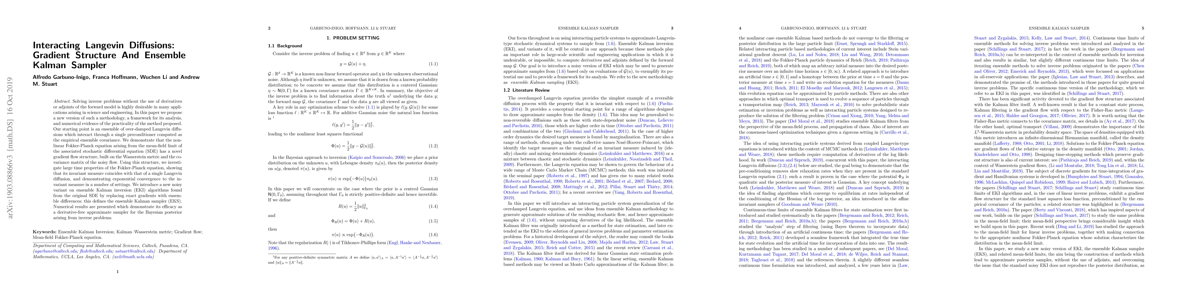 This paper proposes a novel derivative-free methodology for solving inverse problems using interacting Langevin diffusions and introduces a gradient structure based on the Wasserstein metric and ensemble covariance. It presents an ensemble Kalman sampler (EKS) and demonstrates its effectiveness through numerical experiments.