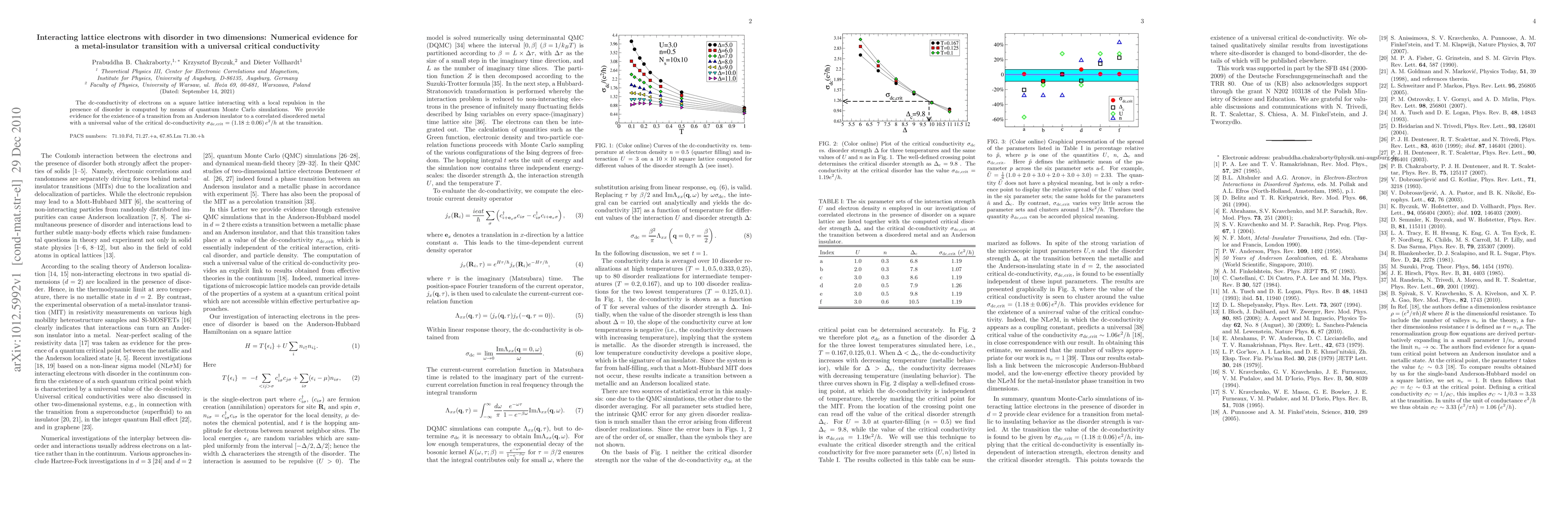 This paper uses quantum Monte Carlo simulations to study interacting lattice electrons with disorder in two dimensions, finding evidence for a metal-insulator transition characterized by a universal critical dc-conductivity value of (1.18 ± 0.06) e²/h.