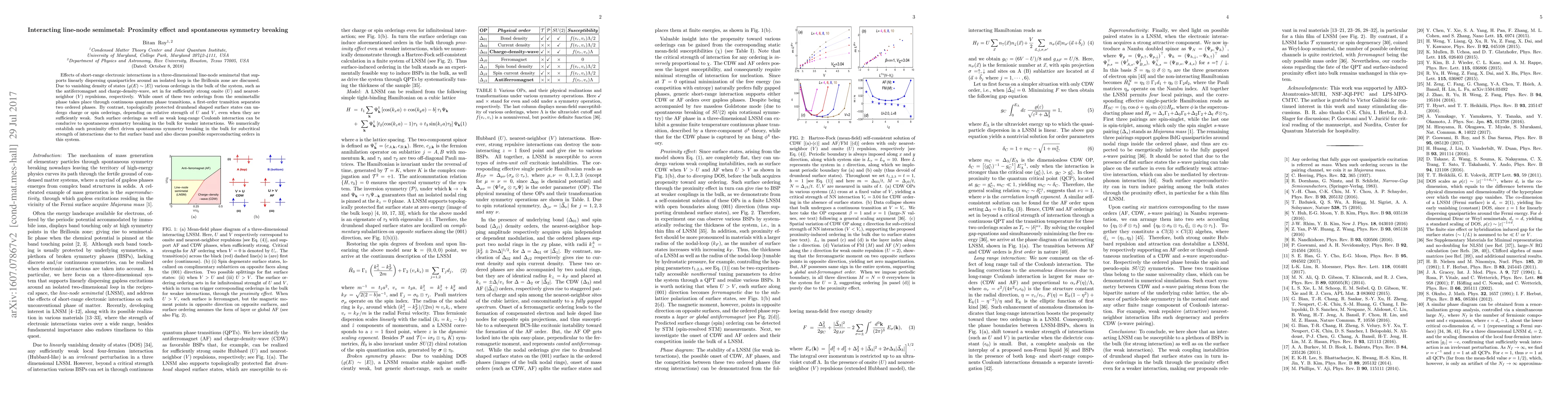 Effects of short-range electronic interactions in a three-dimensional line-node semimetal that supports linearly dispersing quasiparticles around an isolated loop in the Brillouin zone are discussed. Due to vanishing density of states ($\varrho(E) \sim |E|$) various orderings in the bulk of the system, such as the antiferromagnet and charge-density-wave, set in for sufficiently strong onsite ($U$) and nearest-neighbor ($V$) repulsions, respectively. While onset of these two orderings from the semimetallic phase takes place through continuous quantum phase transitions, a first-order transition separates two ordered phases. By contrast, topologically protected drumhead shaped surface states can undergo charge or spin orderings, depending on relative strength of $U$ and $V$, even when they are sufficiently weak. Such surface orderings as well as weak long-range Coulomb interaction can be conducive to spontaneous symmetry breaking in the bulk for weaker interactions. We numerically establish such proximity effect driven spontaneous symmetry breaking in the bulk for subcritical strength of interactions due to flat surface band and also discuss possible superconducting orders in this system.