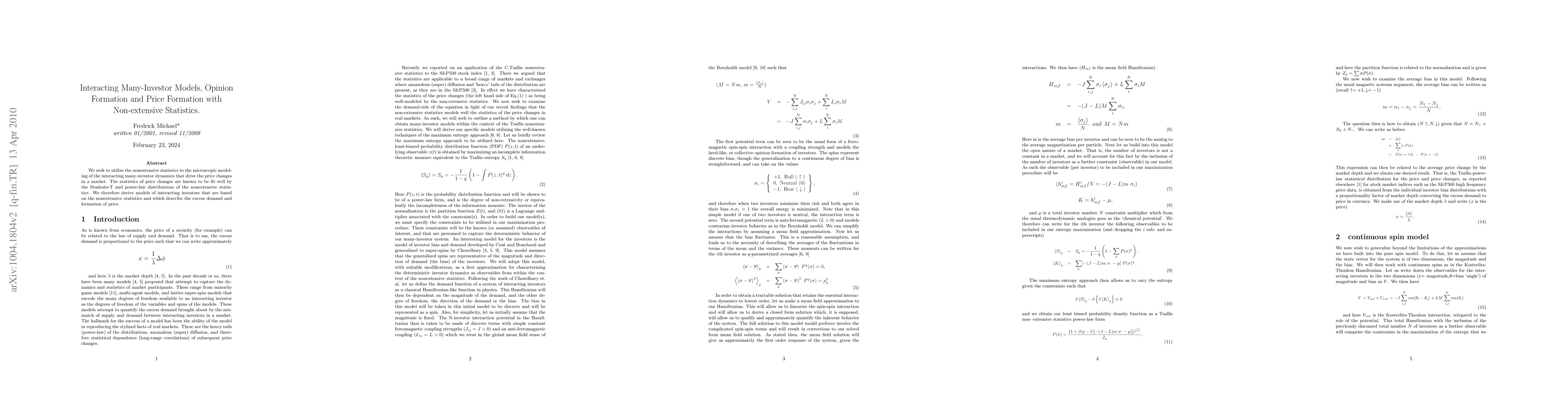 We seek to utilize the nonextensive statistics to the microscopic modeling of the interacting many-investor dynamics that drive the price changes in a market. The statistics of price changes are known to be fit well by the Students-T and power-law distributions of the nonextensive statistics. We therefore derive models of interacting investors that are based on the nonextensive statistics and which describe the excess demand and formation of price.