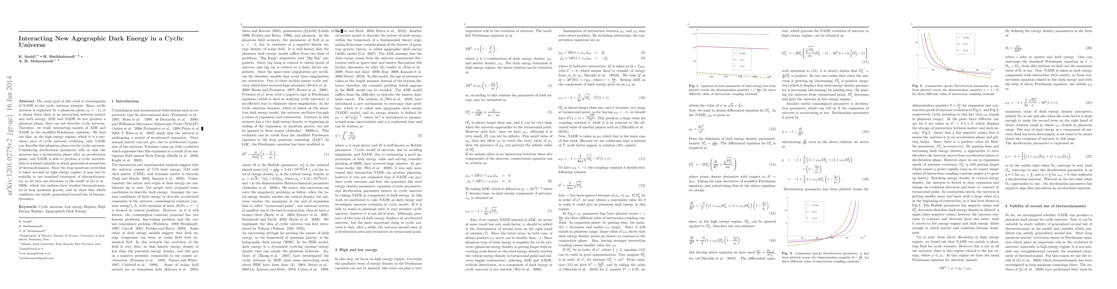 The main goal of this work is investigation of NADE in the cyclic universe scenario. Since, cyclic universe is explained by a phantom phase ($\omega<-1$), it is shown when there is no interaction between matter and dark energy, ADE and NADE do not produce a phantom phase, then can not describe cyclic universe. Therefore, we study interacting models of ADE and NADE in the modified Friedmann equation. We find out that, in the high energy regime, which it is a necessary part of cyclic universe evolution, only NADE can describe this phantom phase era for cyclic universe. Considering deceleration parameter tells us that the universe has a deceleration phase after an acceleration phase, and NADE is able to produce a cyclic universe. Also it is found valuable to study generalized second law of thermodynamics. Since the loop quantum correction is taken account in high energy regime, it may not be suitable to use standard treatment of thermodynamics, so we turn our attention to the result of \citep{29}, which the authors have studied thermodynamics in loop quantum gravity, and we show that which condition can satisfy generalized second law of thermodynamics.