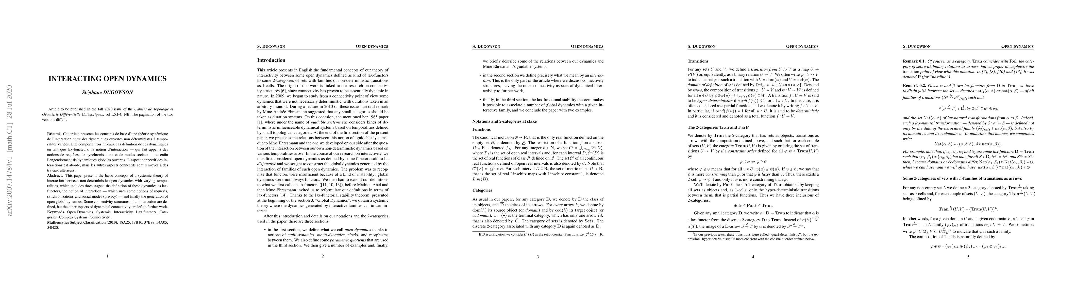 This paper presents the basic concepts of a systemic theory of interaction between non-deterministic open dynamics with varying temporalities, which includes three stages: the definition of these dynamics as lax-functors, the notion of interaction -- which uses some notions of requests, synchronizations and social modes (privacy) -- and finally the generation of open global dynamics. Some connectivity structures of an interaction are defined, but the other aspects of dynamical connectivity are left to further work.