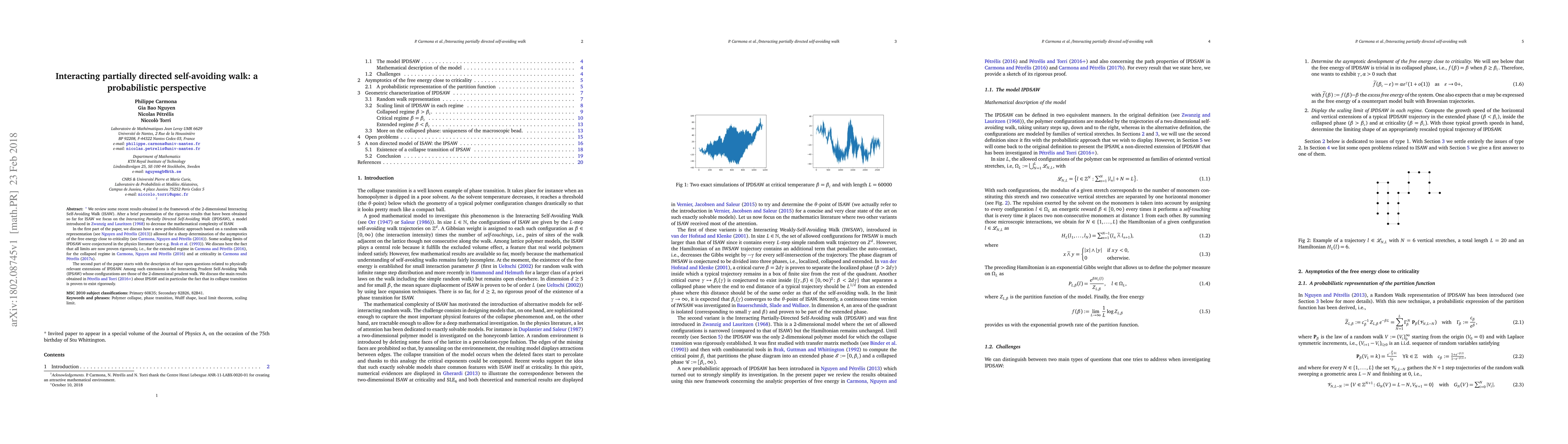 We review some recent results obtained in the framework of the 2-dimensional Interacting Self-Avoiding Walk (ISAW). After a brief presentation of the rigorous results that have been obtained so far for ISAW we focus on the Interacting Partially Directed Self-Avoiding Walk (IPDSAW), a model introduced in Zwanzig and Lauritzen (1968) to decrease the mathematical complexity of ISAW. In the first part of the paper, we discuss how a new probabilistic approach based on a random walk representation (see Nguyen and P\'etr\'elis (2013)) allowed for a sharp determination of the asymptotics of the free energy close to criticality (see Carmona, Nguyen and P\'etr\'elis (2016)). Some scaling limits of IPDSAW were conjectured in the physics literature (see e.g. Brak et al. (1993)). We discuss here the fact that all limits are now proven rigorously, i.e., for the extended regime in Carmona and P\'etr\'elis (2016), for the collapsed regime in Carmona, Nguyen and P\'etr\'elis (2016) and at criticality in Carmona and P\'etr\'elis (2017a). The second part of the paper starts with the description of four open questions related to physically relevant extensions of IPDSAW. Among such extensions is the Interacting Prudent Self-Avoiding Walk (IPSAW) whose configurations are those of the 2-dimensional prudent walk. We discuss the main results obtained in P\'etr\'elis and Torri (2016+) about IPSAW and in particular the fact that its collapse transition is proven to exist rigorously.