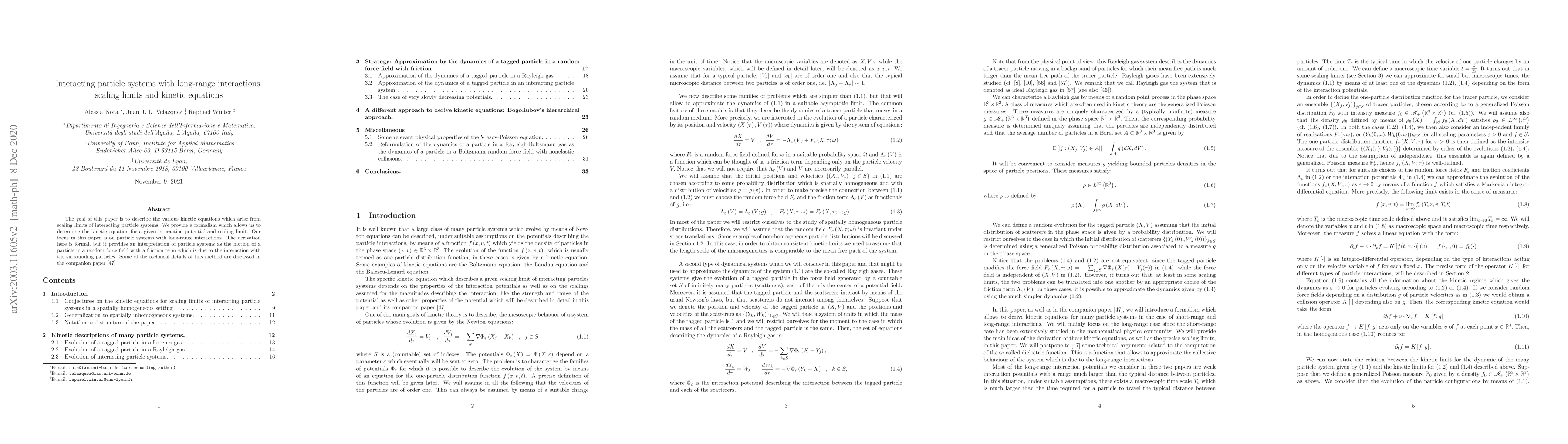 This paper develops a formalism to determine kinetic equations from scaling limits of interacting particle systems, especially those with long-range interactions, and interprets these systems as particles moving in a random force field with interaction-induced friction. The technical derivation is detailed formally, with more specifics provided in a companion paper.